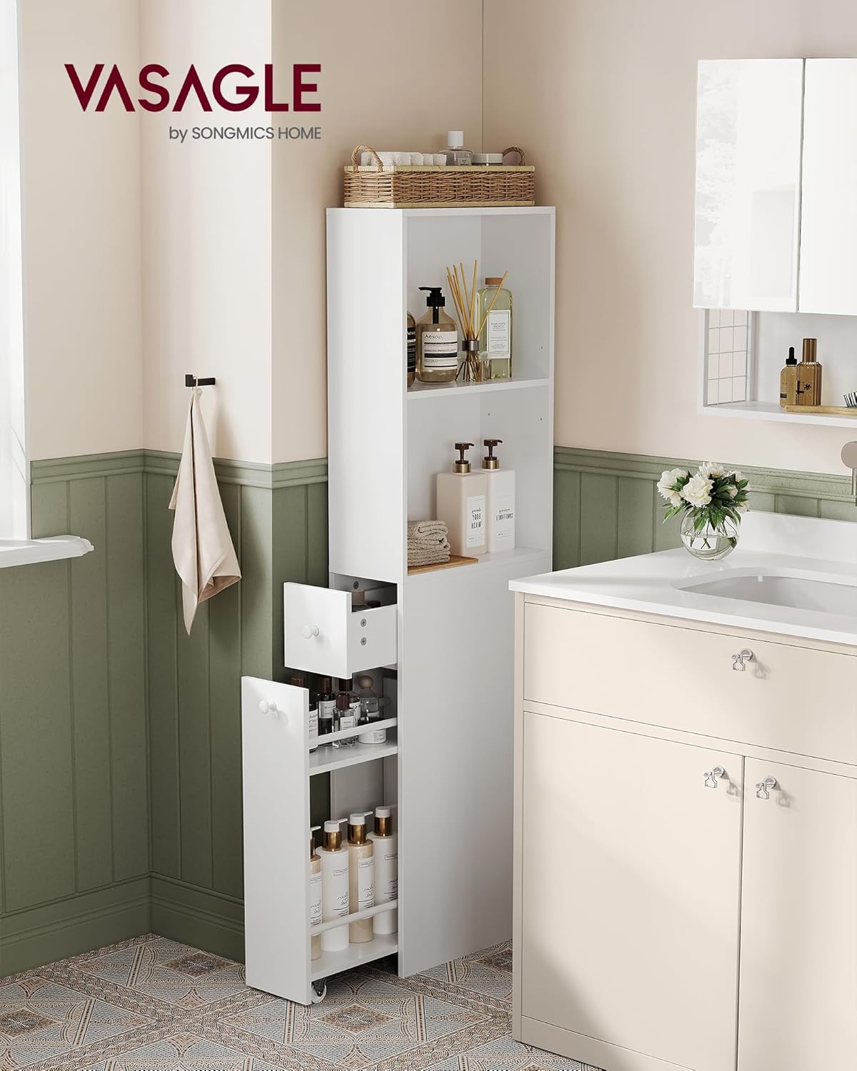 - [Sturdy and Stable] Constructed from quality MDF, this slim bathroom storage unit boasts great strength and stability, giving your items reliable support. The included anti-tip kit further enhances overall stability