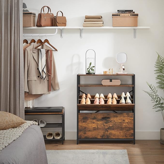 - Impressive style: style should also be present in a shoe cabinet. The mix of rustic brown chipboard and black steel frame provides a chic industrial touch that will impress your guests