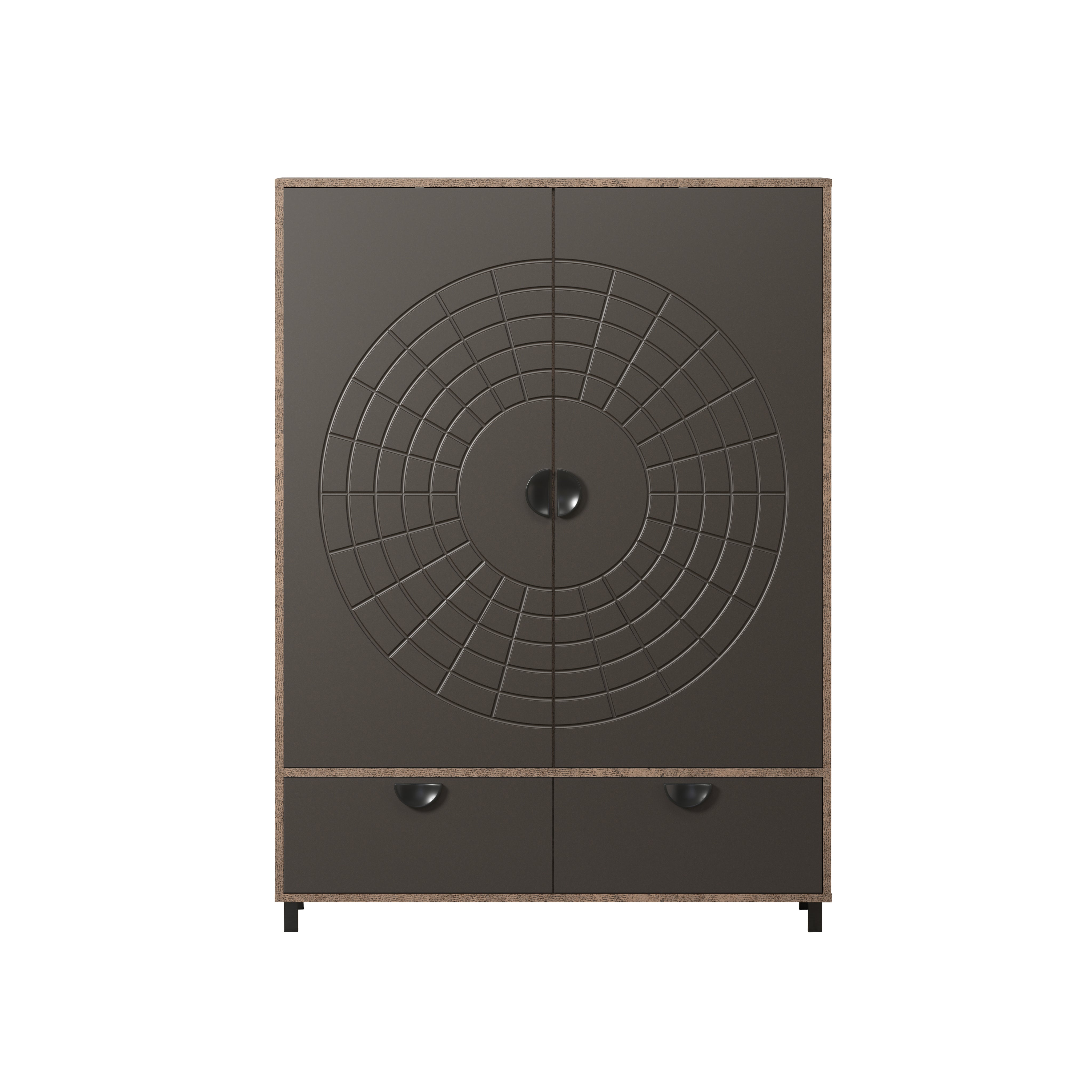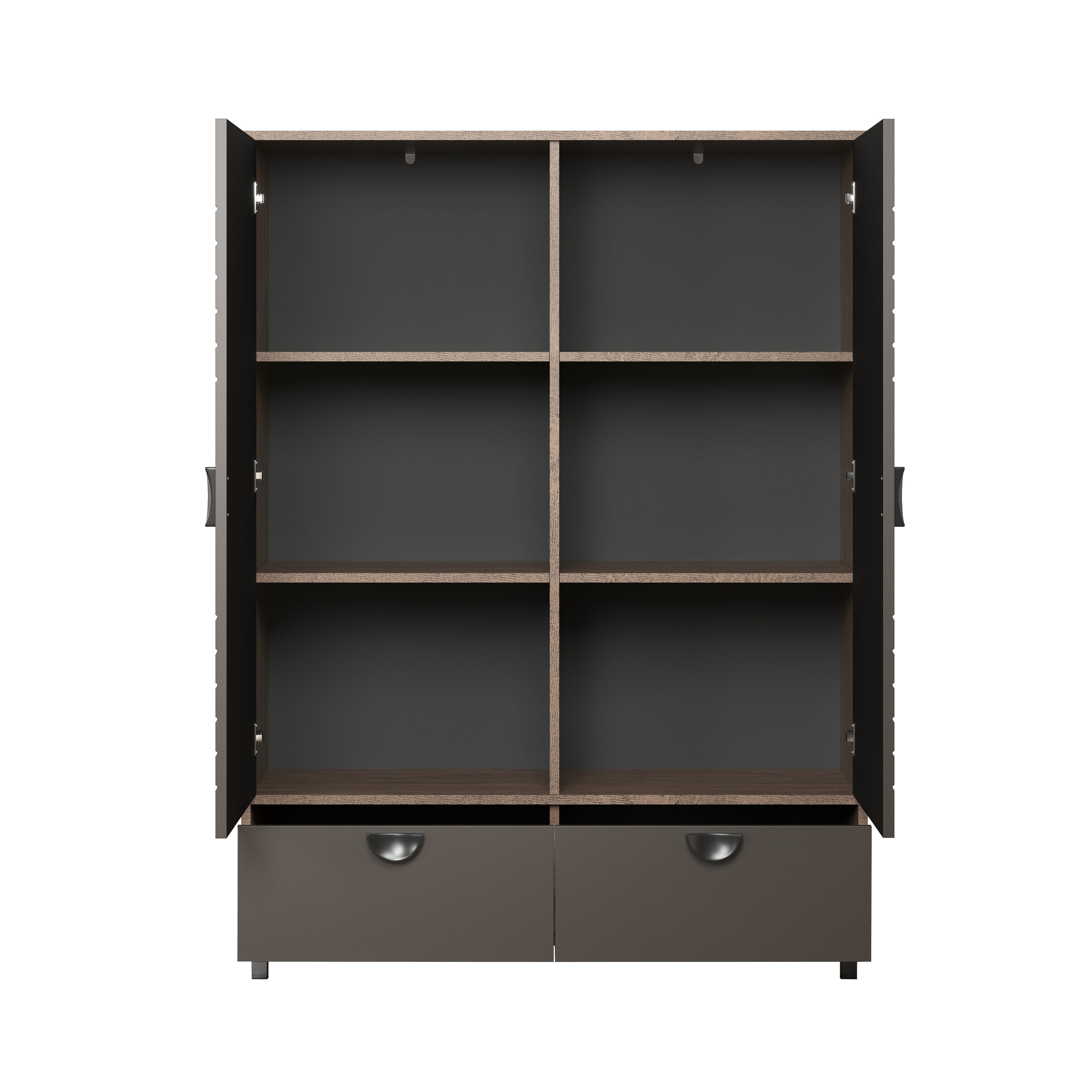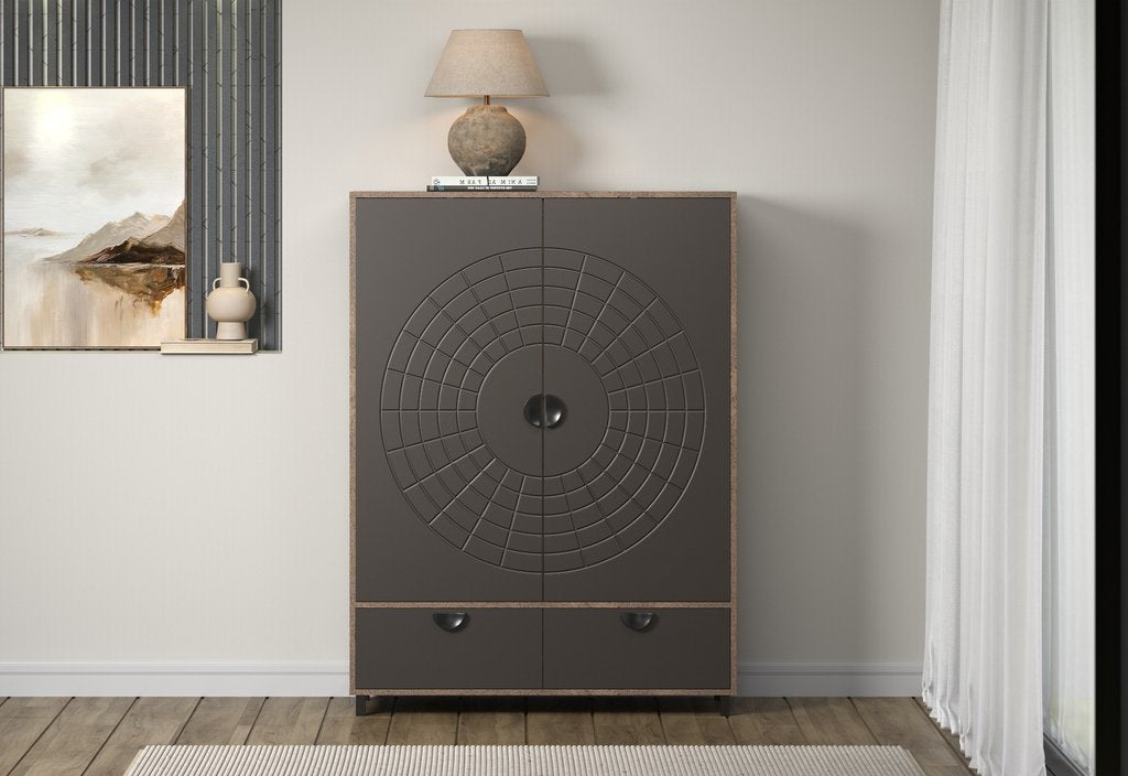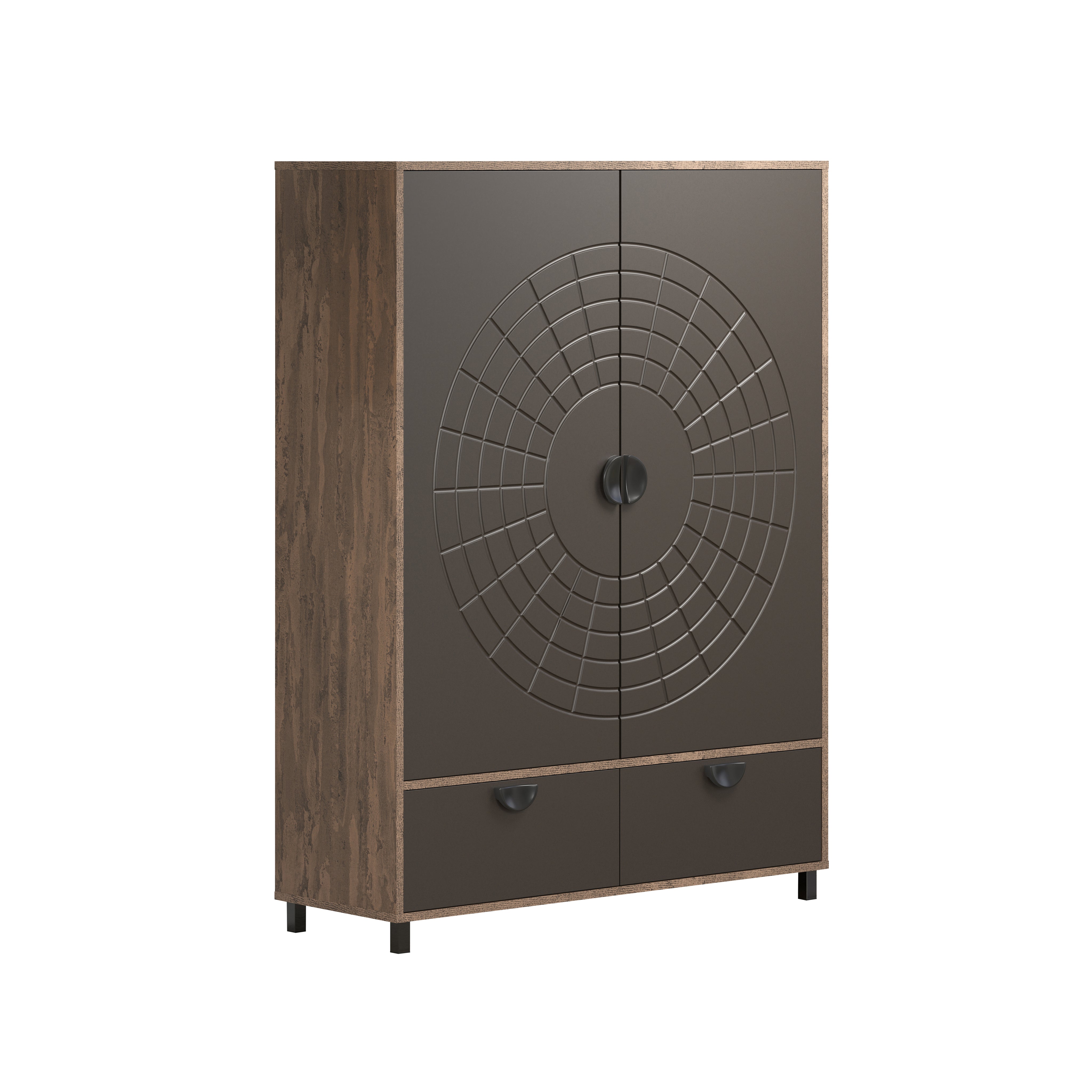 The Fusion high cabinet brings a bold and elegant statement to any modern living space. Designed in a unique Rusty Flow melamine wood tone paired with Pearl Bronze front detailing, it offers both stylish character and practical storage. With doors and lower drawers, it provides a well-organized space for everyday items, décor, books, or household necessities.