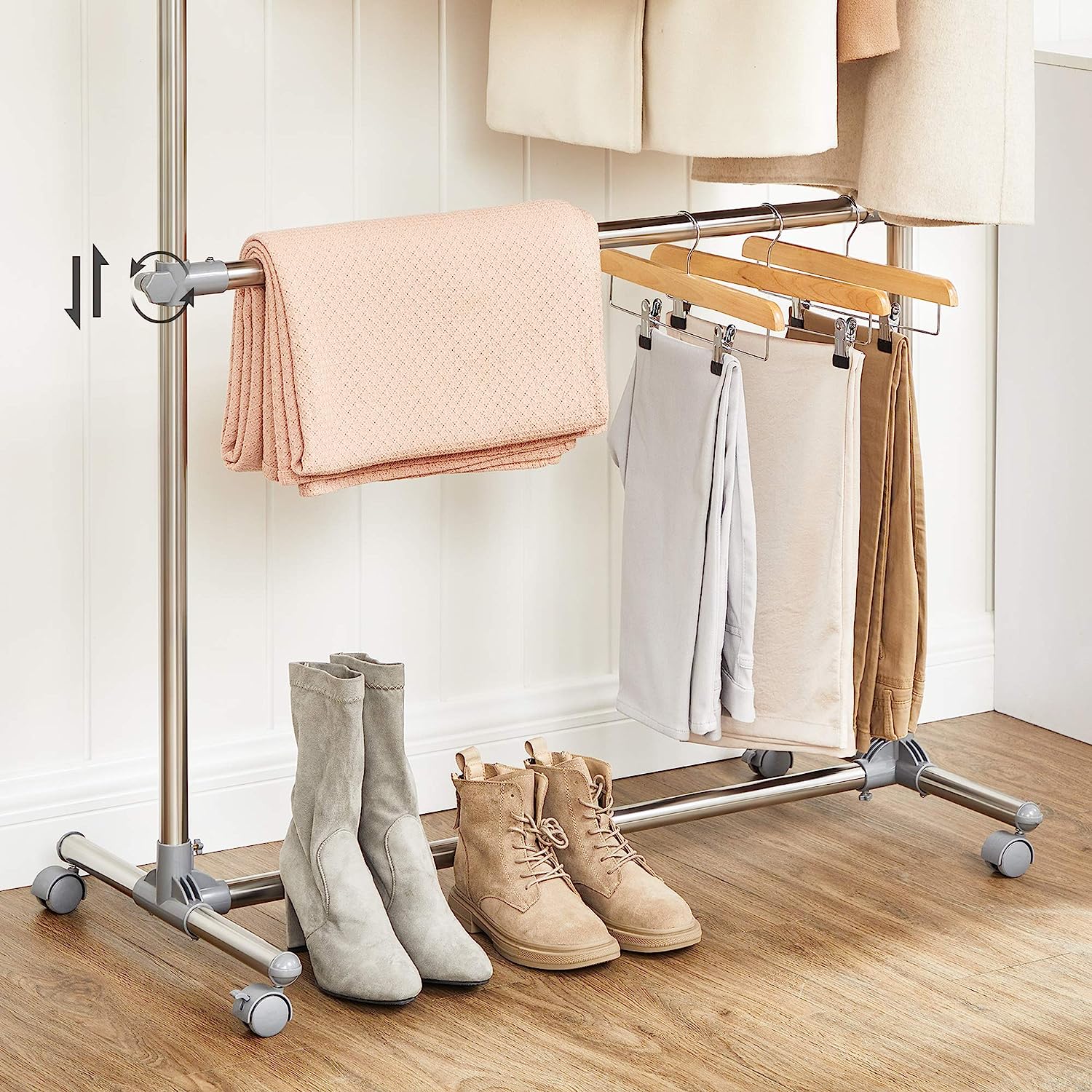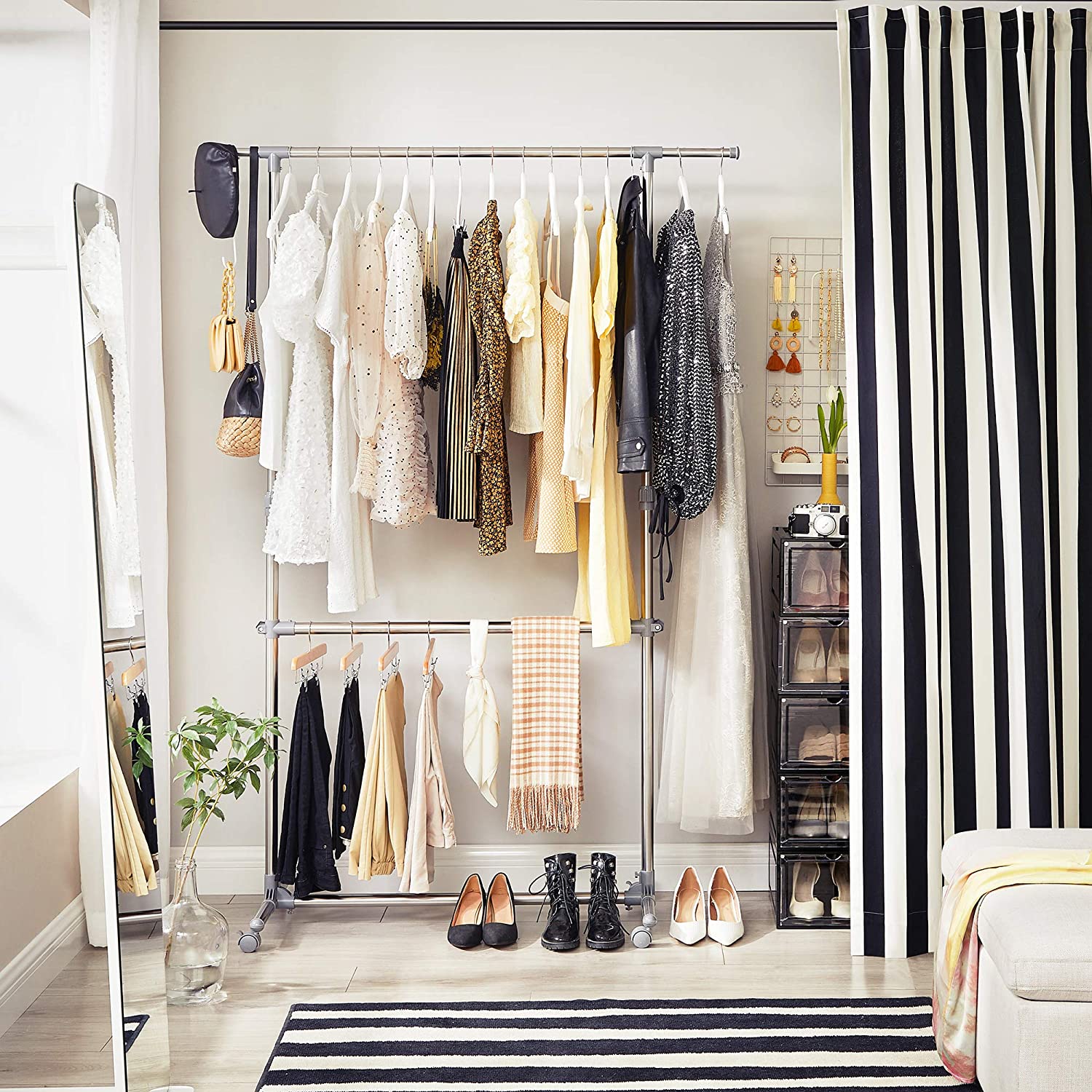 - WHAT YOU GET: A sturdy clothes rack with 2 clothes rails, from which you can hang numerous clothing, bags, towels, or bed linens, and which fits in your bedroom as well as in your hallway or cellar