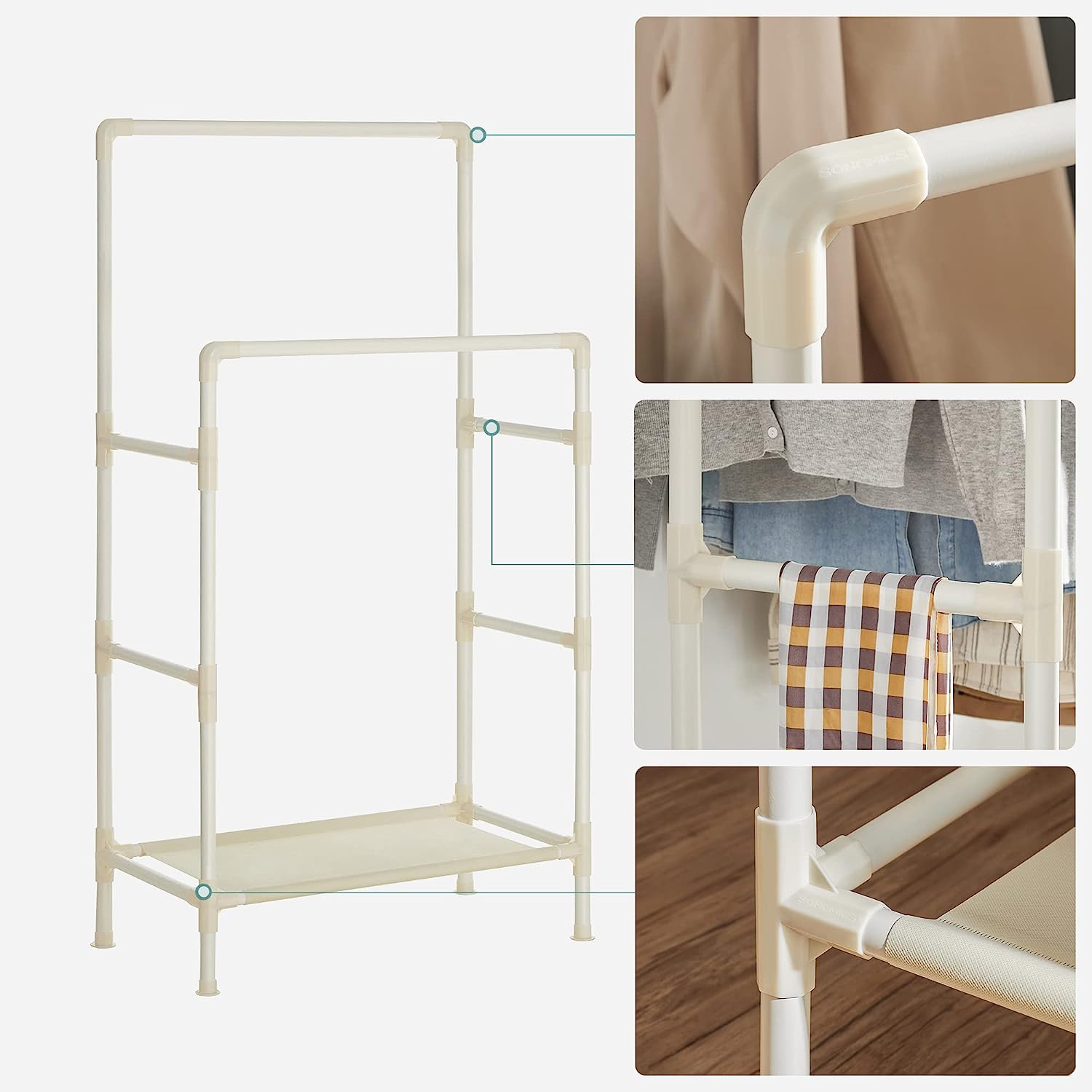 - Everything in one place: That's a good idea! Dresses and suits on the 2 bars, bags and shoes on the shelf, scarves and ties on the side crossbars. From now on, you just have to take a look at this clothes rack in the morning to choose the right outfit.