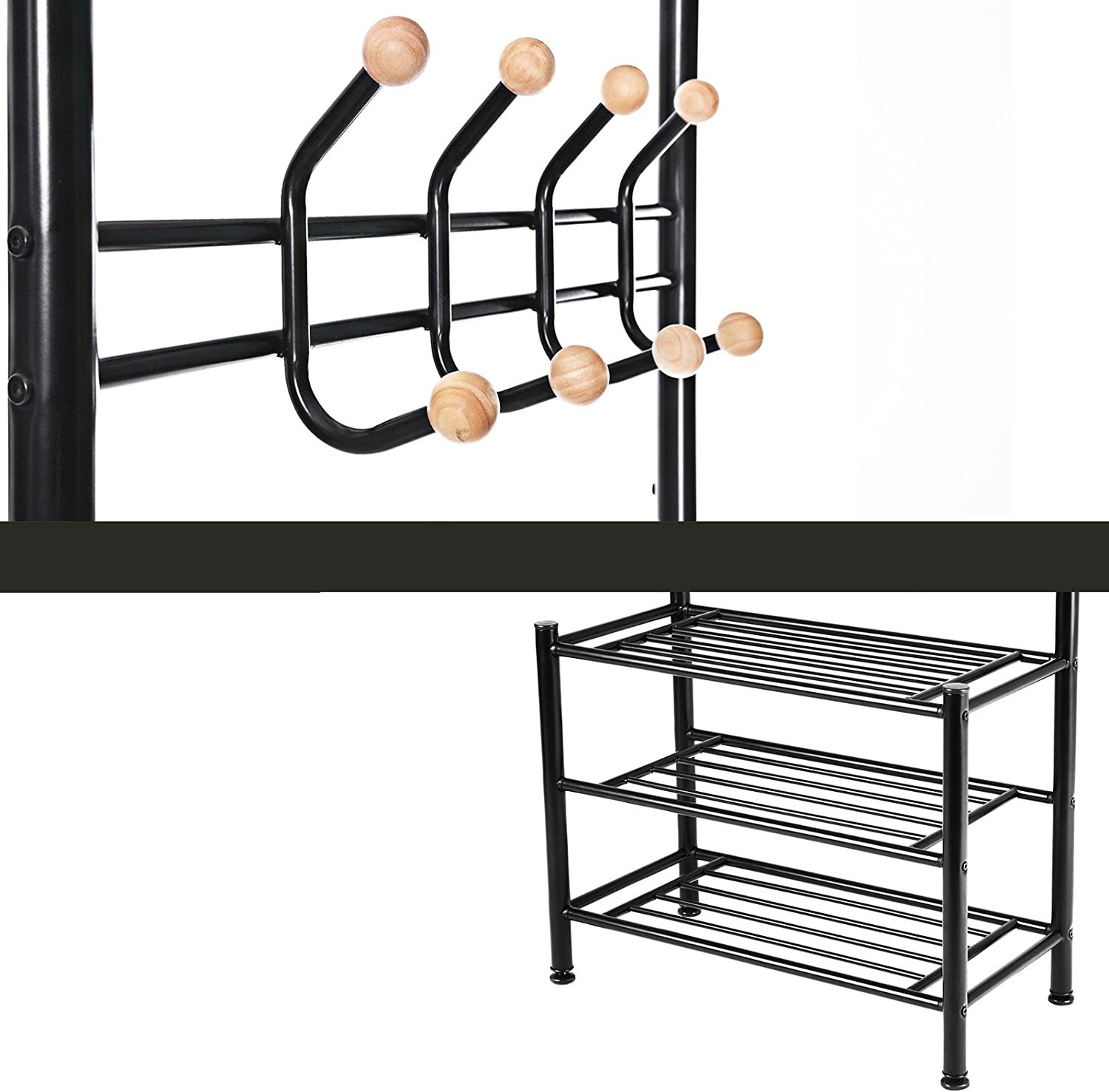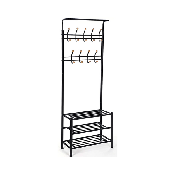- HOOKS, SHELVES, THRIVING STORAGE: Is there a mess in your hallway? With 18 hooks on 2 heights for coats, jackets, and hats, and 3 shelves at the bottom for shoes and bags, there’s plenty of space for your belongings