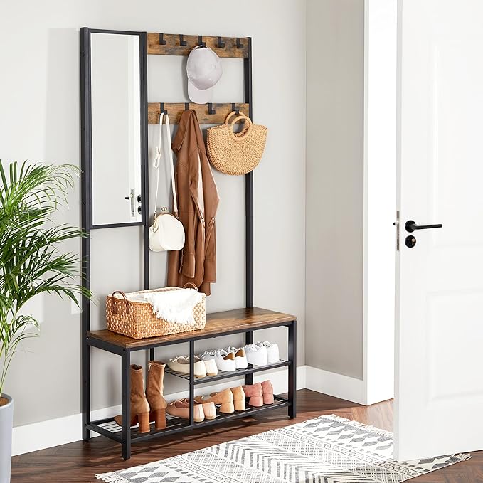 The industrial hall hanger with mirror, hooks, shelves and bench will ensure order not only in the hall, but wherever you decide to install it.