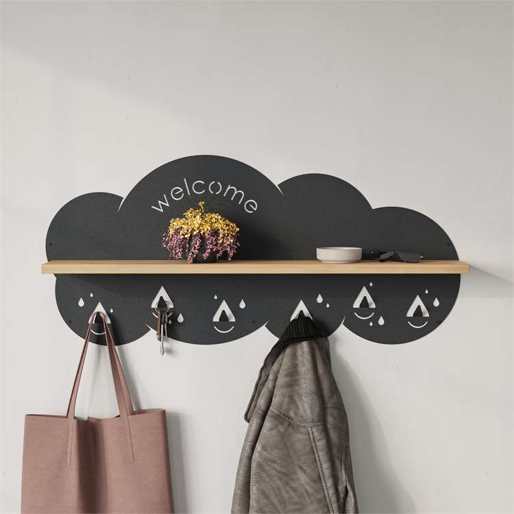 Add a playful and practical touch to your entryway with this Cloud-Shaped Wall Shelf Organizer. Featuring a charming black chalkboard-style cloud design with raindrop-shaped cut-outs, this piece includes a natural wood shelf for small décor or everyday essentials and five sturdy hooks for coats, bags, and keys. The cheerful "welcome" message adds a warm, inviting vibe to your space. Ideal for entryways, kids' rooms, or creative spaces, it blends whimsy with everyday functionality.