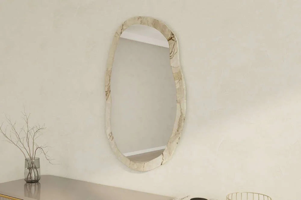 Soft shapes for a modern home. This statement wall mirror features a trend-forward, organic "pebble" silhouette that adds a natural, artistic touch to your decor. Wrapped in a sophisticated marble-effect frame, it effortlessly blends luxury with a relaxed, contemporary vibe.