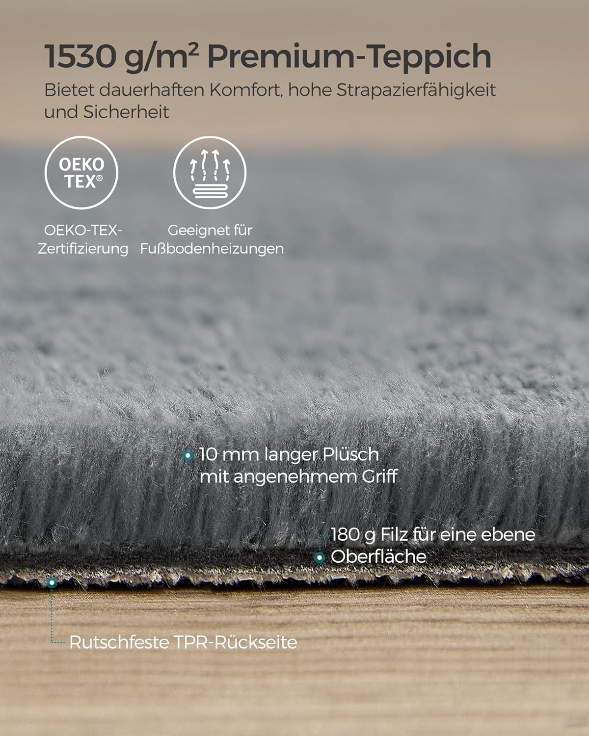 Soft and safe: This rug is made of 100% polyester and feels soft. It is certified according to Oeko-Tex Standard 100 and thus meets the strictest safety standards for textiles (certificate number: SHO25 152411, owner: supplier)