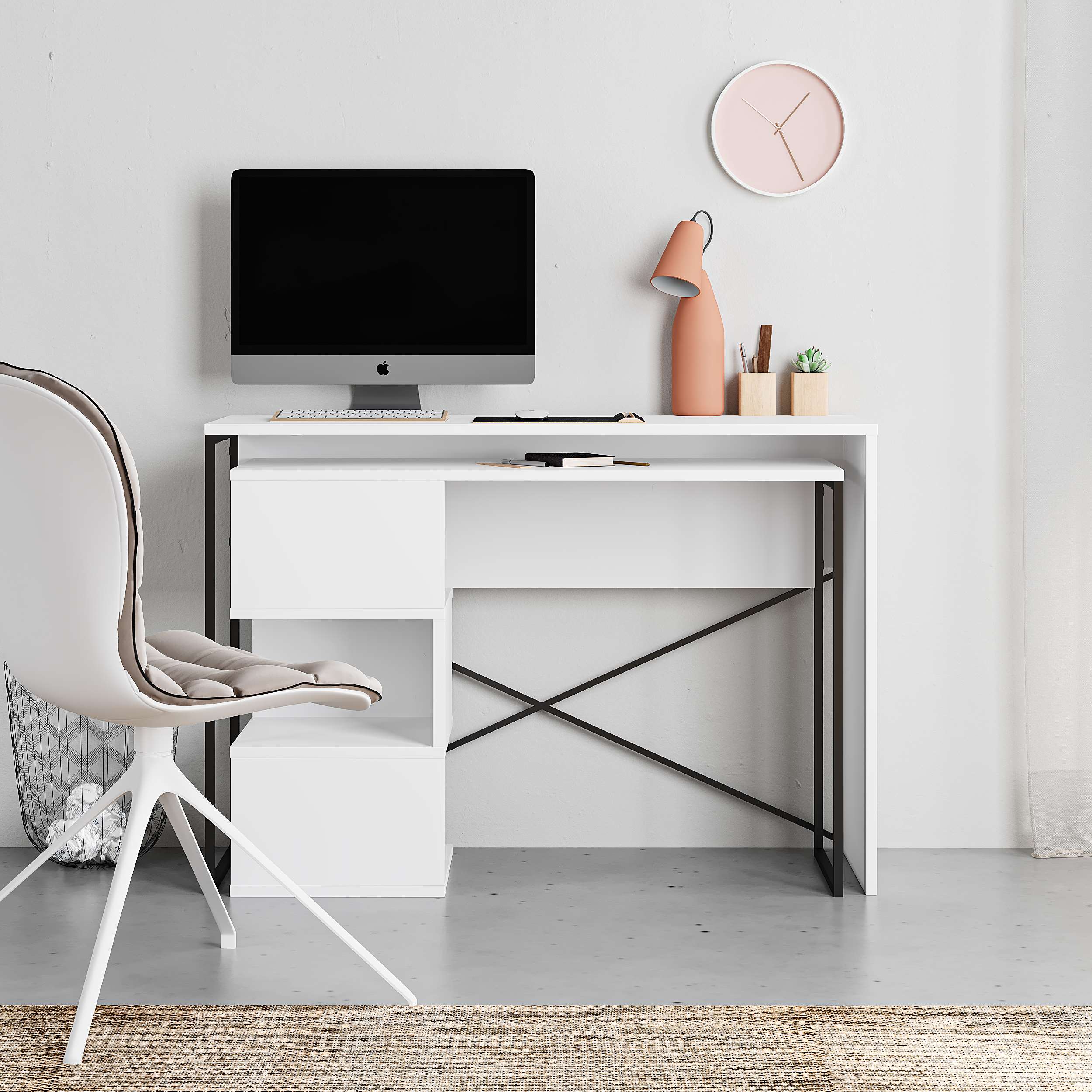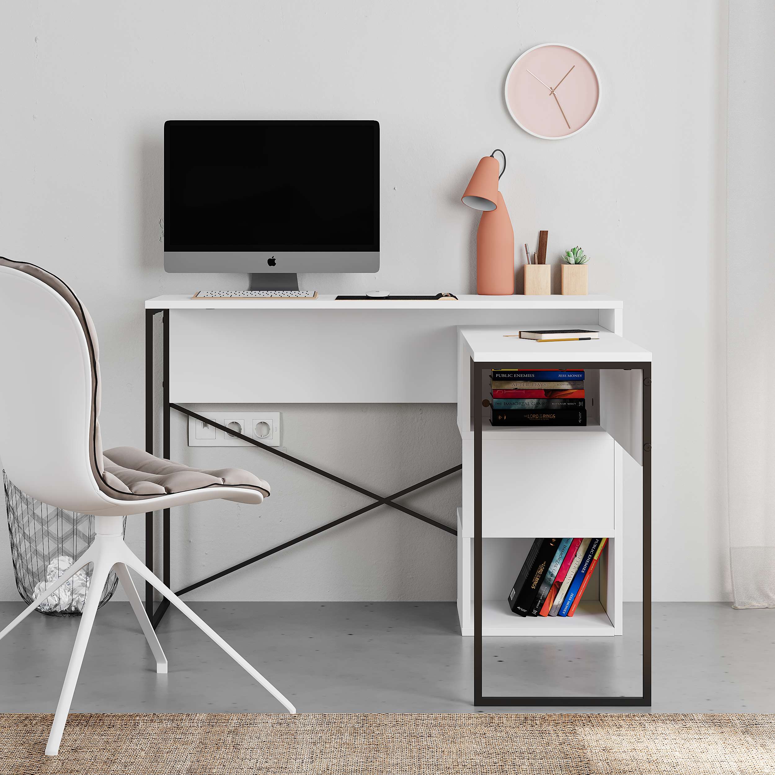 This two-part desk combines a spacious desk with sturdy black metal legs and a smaller desk featuring open storage spaces. Perfect for keeping your books, ornaments, or work essentials within easy reach, this segment adds a practical touch to your workspace.