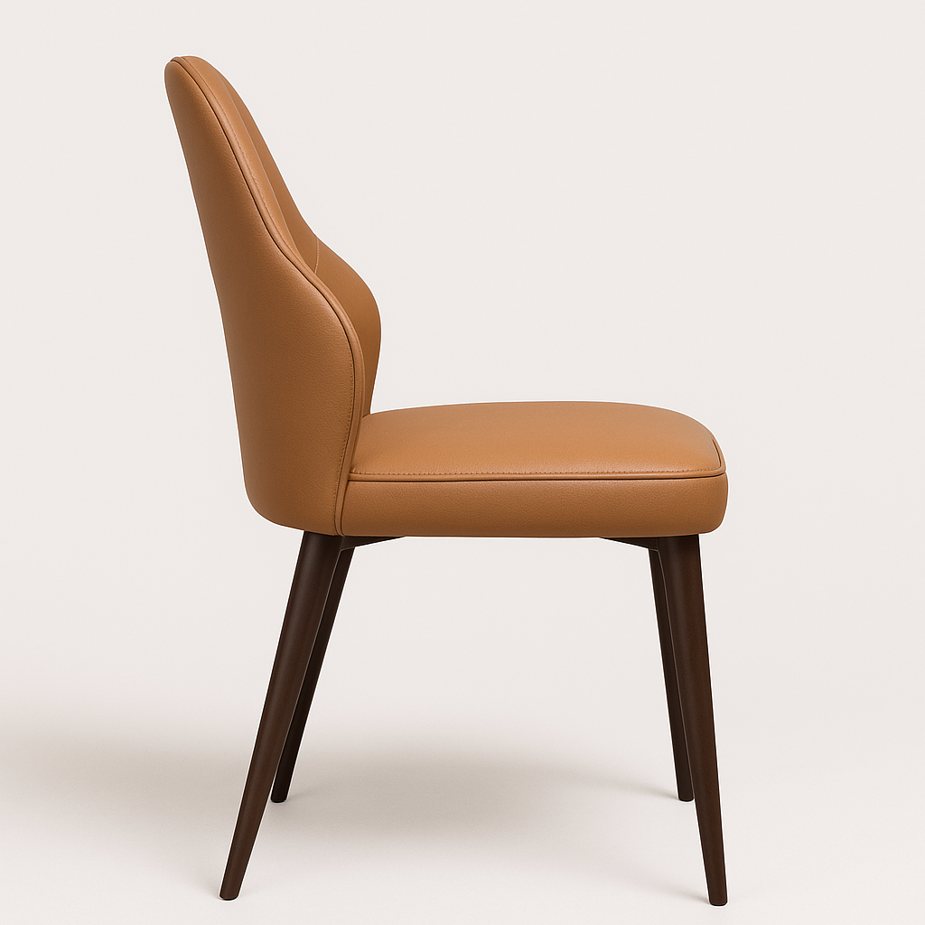Elevate your dining space with this set of 2 modern dining chairs, crafted for both comfort and elegance. Upholstered in smooth camel brown faux leather, each chair features a gently curved backrest with stylish stitched detailing that adds a touch of sophistication. The padded seat provides superior comfort, while the sturdy walnut-finished legs ensure durability and stability.