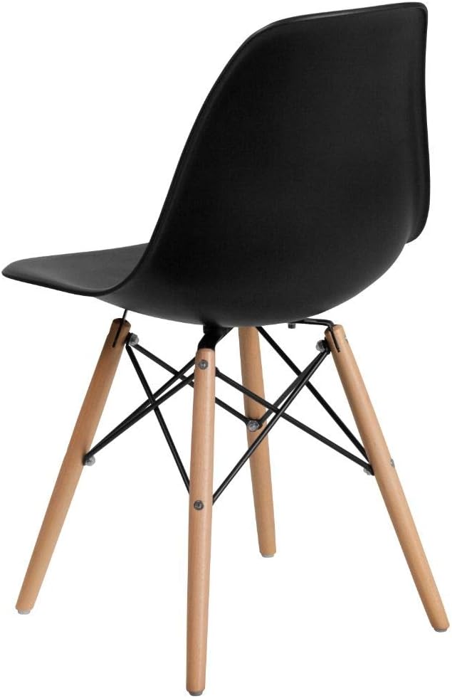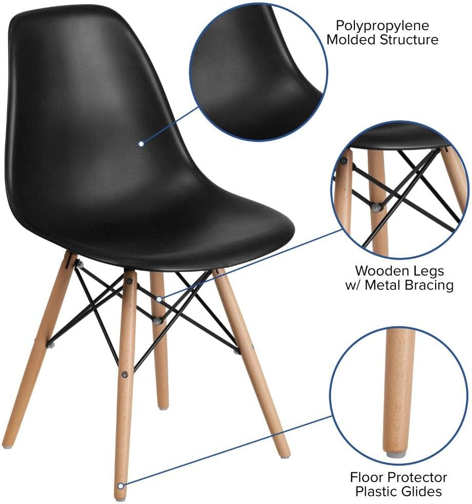 - Sturdy, molded plastic armless chairs with beech wood legs, metal stability frame and foot caps to help protect floors
