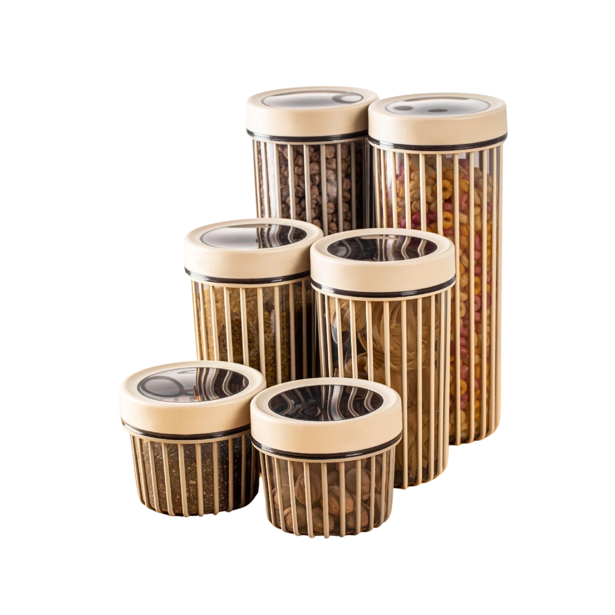 Organize your pantry in style with this 6-piece modern beige airtight container set. Designed with vertical stripe accents and a clean, minimal aesthetic, these containers feature transparent sides for quick content identification and airtight lids to ensure maximum freshness. Ideal for storing pasta, legumes, spices, snacks, grains, and more.