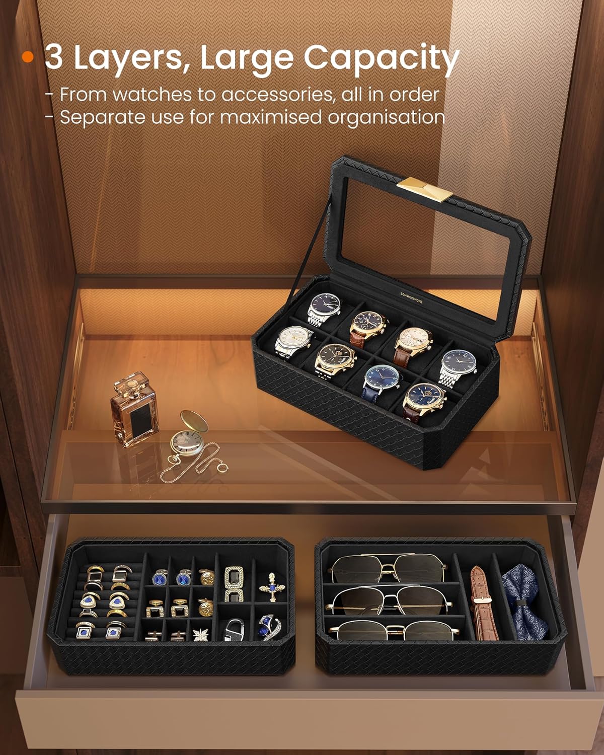 【3 LAYERS, BIG ON CAPACITY】Generously designed for trendsetters, the top tier accommodates 8 watches of all sizes, the middle tray houses rings, brooches, and cufflinks, while the bottom tray holds 3 pairs of sunglasses and 2 watch bands—everything's home