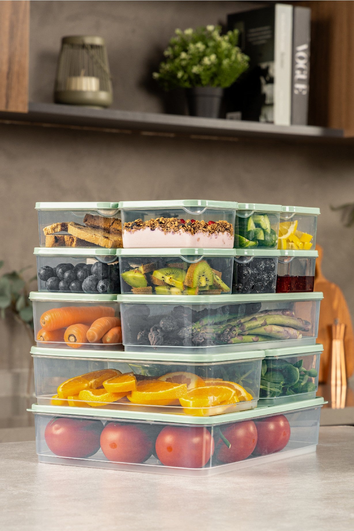 Organize your fridge and pantry with this versatile 17-piece rectangular food storage container set. Designed with a fresh green lid and clear body, these containers help you easily identify contents while keeping food fresh. Ideal for storing fruits, vegetables, meats, cheeses, snacks, and leftovers. Their stackable and space-saving design makes them perfect for refrigerators, freezers, and cabinets. Made from high-quality BPA-free plastic, they are durable, leak-resistant, and easy to clean.