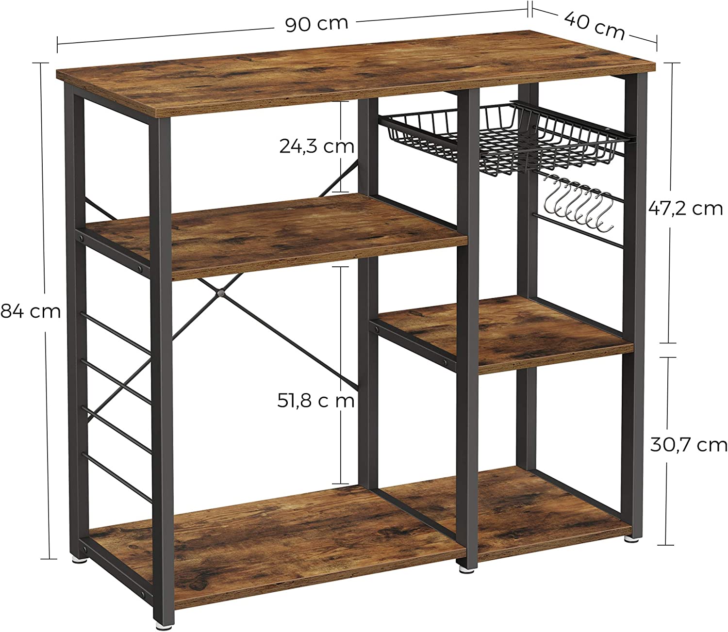 - Chaos Coordinator: If the mixing bowl has to be placed on the stove or the kettle on the floor, it’s high time for this kitchen shelf! It offers numerous shelves for storing baking utensils and more. Your microwave oven can also fit on the 90 x 40 cm work surface