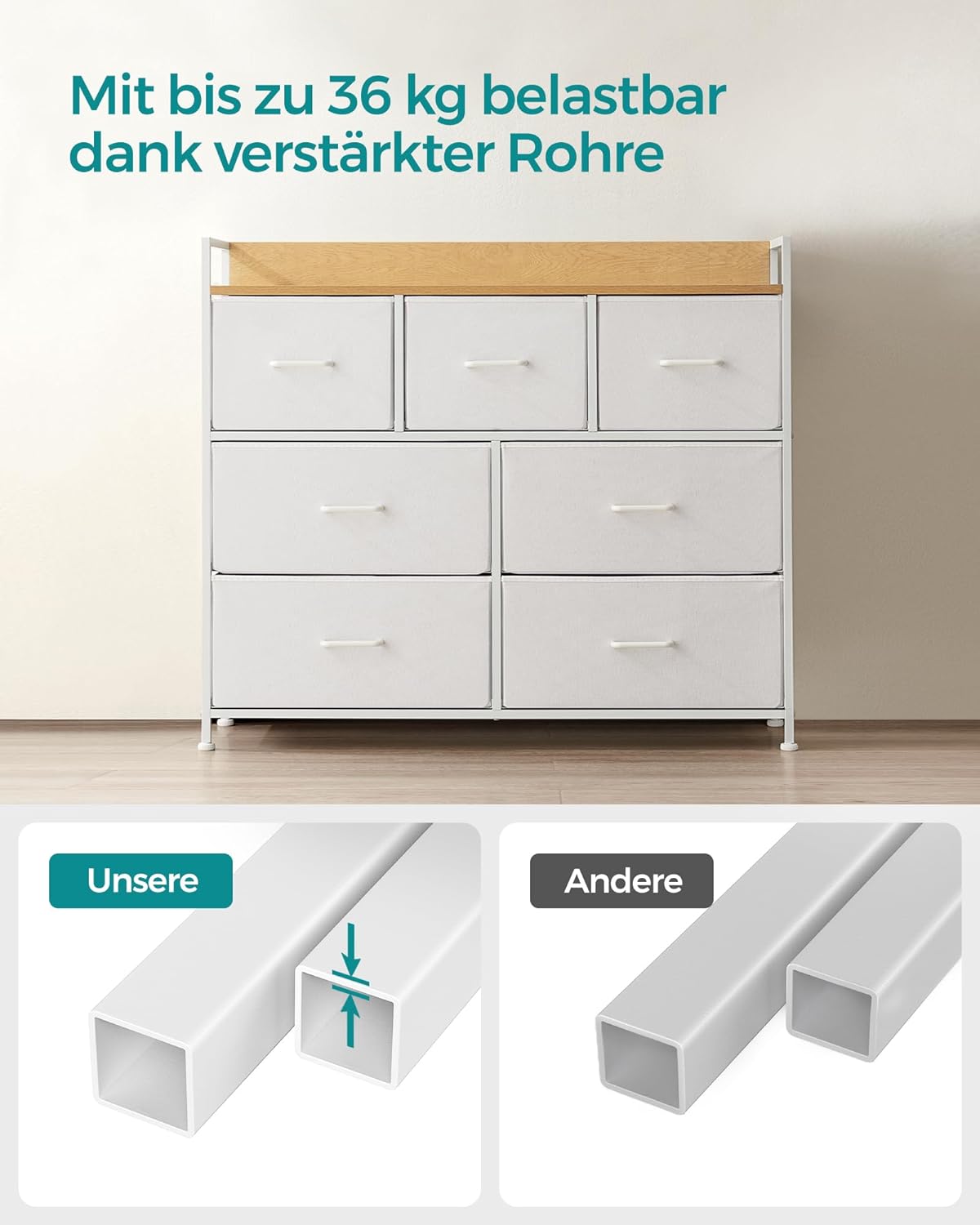 - [Stable and Safe] This chest of drawers is equipped with adjustable feet that create stability even on uneven floors. The included tilt protection guarantees additional stability and safety