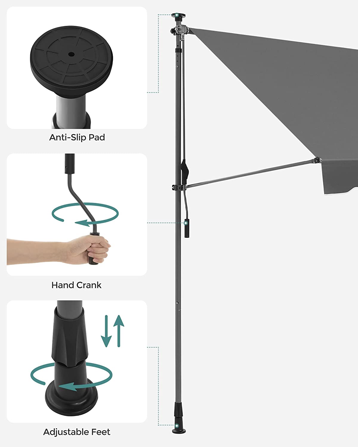 - What you get: a 350 x 130 cm large, height-adjustable balcony awning from Songmics, whose angle can also be individually adjusted, as well as a way to enjoy the summer in the shade