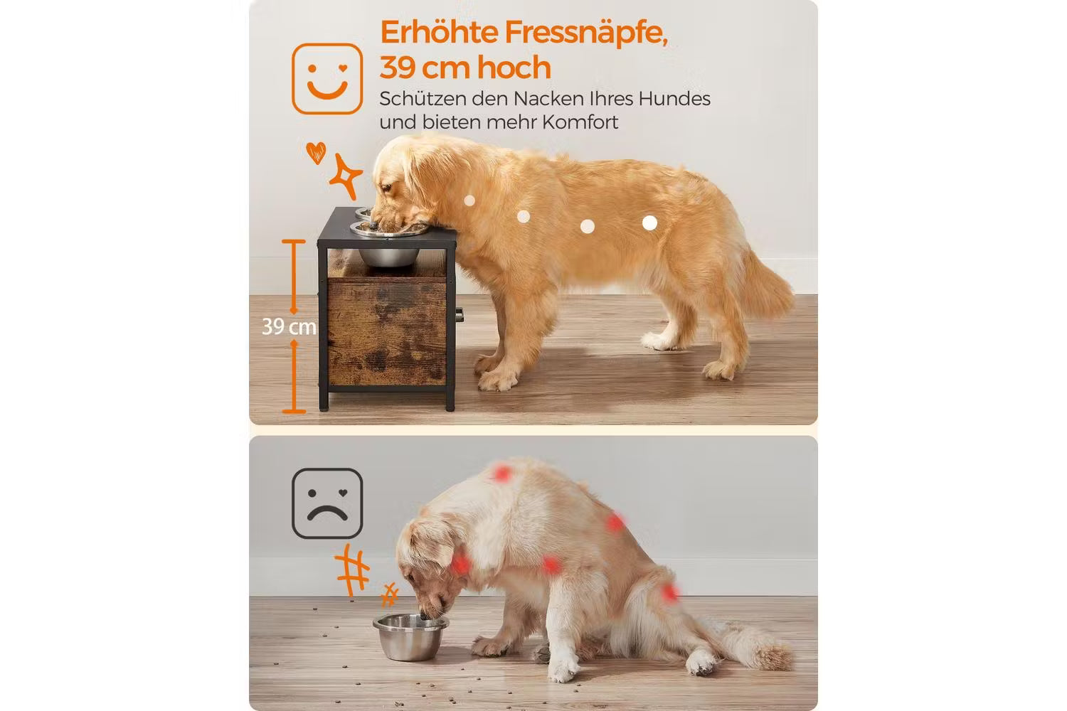 - [Robust, durable, stable] Thanks to its robust steel frame and water and scratch resistant veneered chipboard, the dog bowl with frame is durable. The adjustable feet and wheel under the drawer provide extra stability