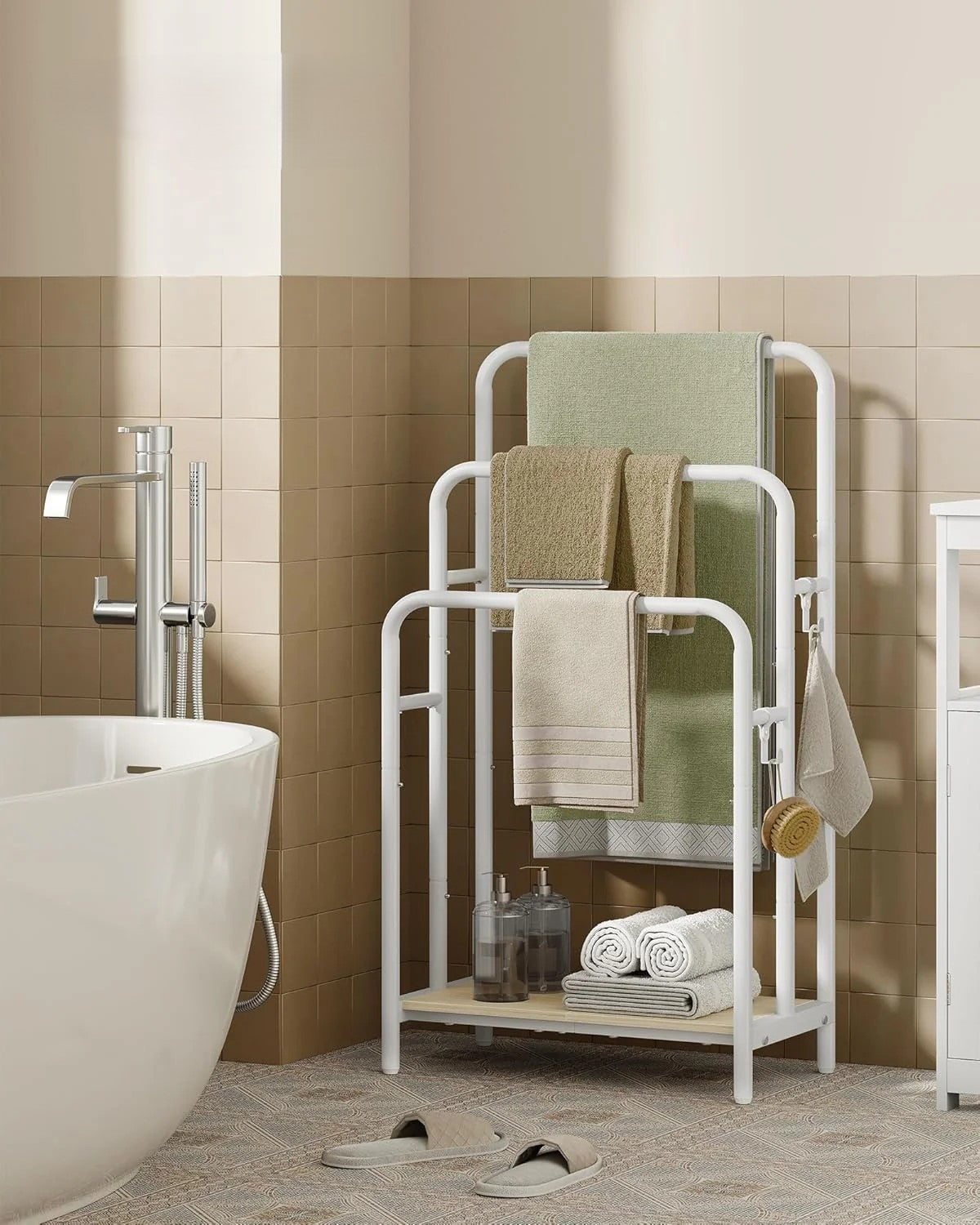 【EXTRA STORAGE】This towel rack stand includes 2 hooks for hanging bath sponges and small items. The bottom shelf is suitable for storage baskets and other bath essentials to keep your bathroom organized