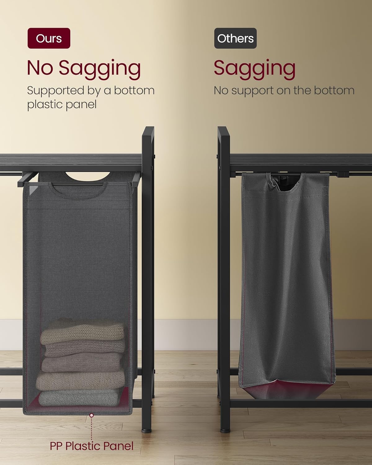 [Sturdy & Stable] Crafted with a 2 cm steel tube frame and MDF panel, this laundry basket supports up to 30 kg on its top shelf. In addition, each liner is made of water-repellent Oxford fabric, and the four adjustable feet provide stability