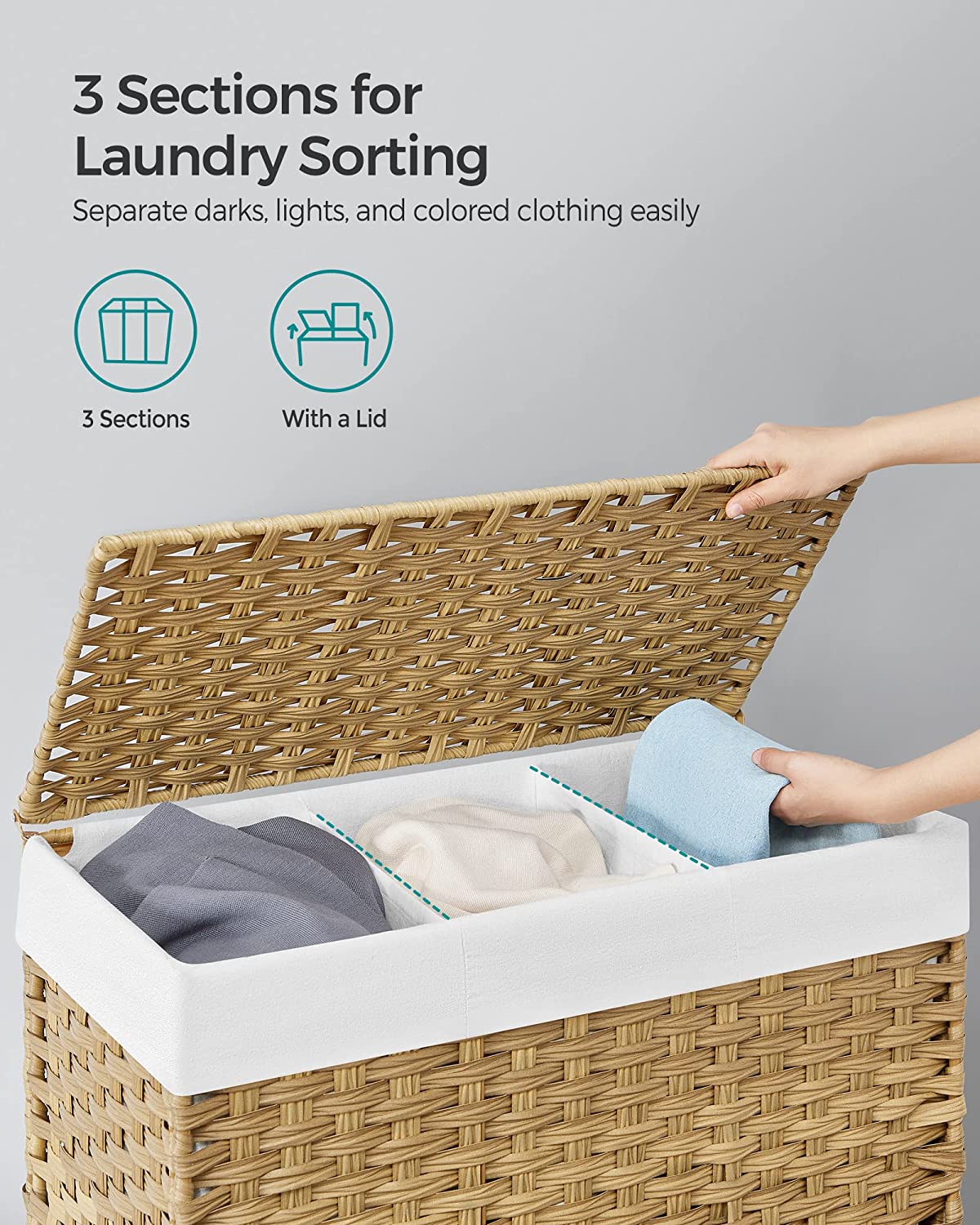 - [3-Section Laundry Basket with Lid] The lid can be easily opened with one hand and helps to contain unpleasant odours and keep dust out. The 3 separate sections allow you to pre-sort your laundry into darks, lights, and coloured clothing for easy washing