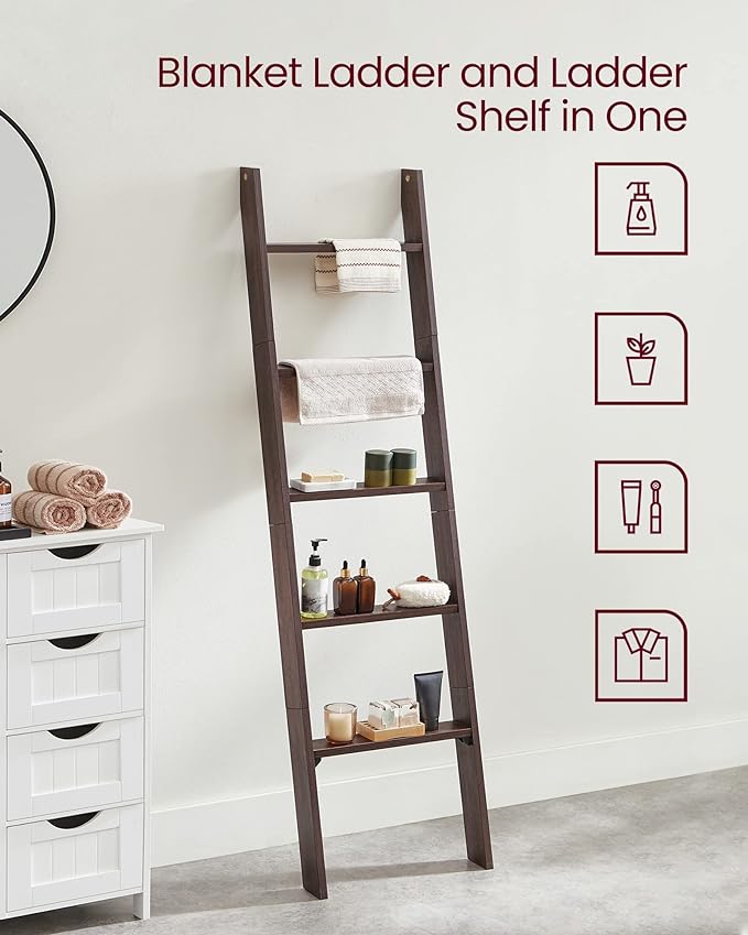 - [2-in-1 Ladder] Featuring 5 deep rungs, this ladder works not only as a blanket ladder for displaying towels, blankets, or quilts but also as a ladder shelf for organizing cosmetics, toiletries, or small decorations