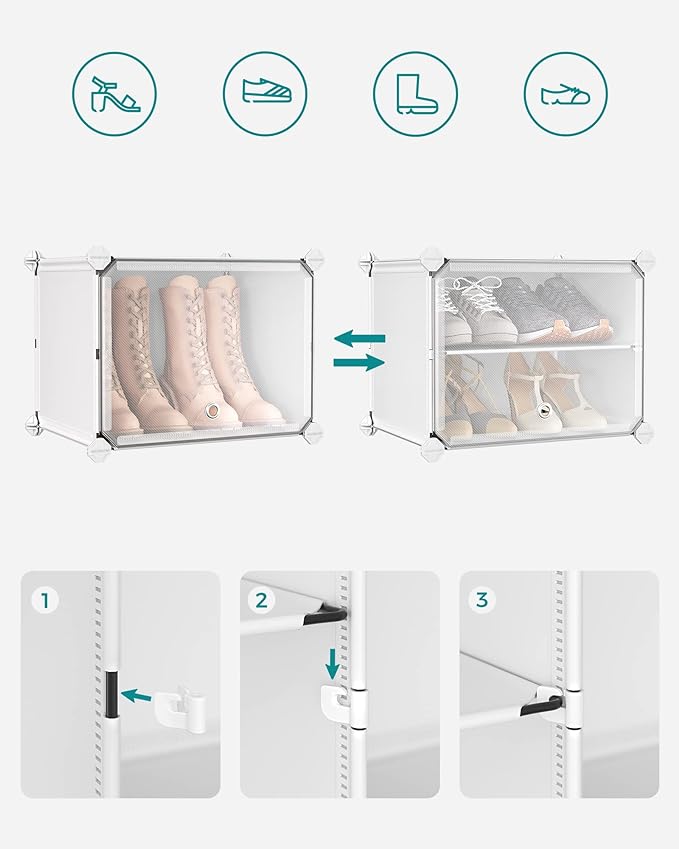 - [Sturdy and Safe] Made with high-quality connectors, plastic panels, and robust steel wire, each compartment of this shoe cabinet supports up to 5 kg. The included anti-tip kit enhances safety for use in living rooms or bedrooms