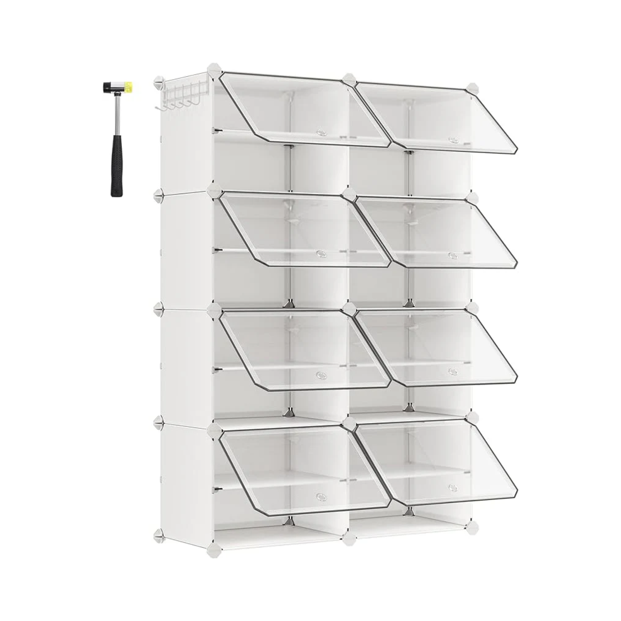 - [Plenty of Space] This plastic shoe storage organiser, capable of holding up to 32 pairs of shoes, can also be used to store bags and clothing. With its space-saving side hooks, it's a convenient way to hang hats or dog leashes