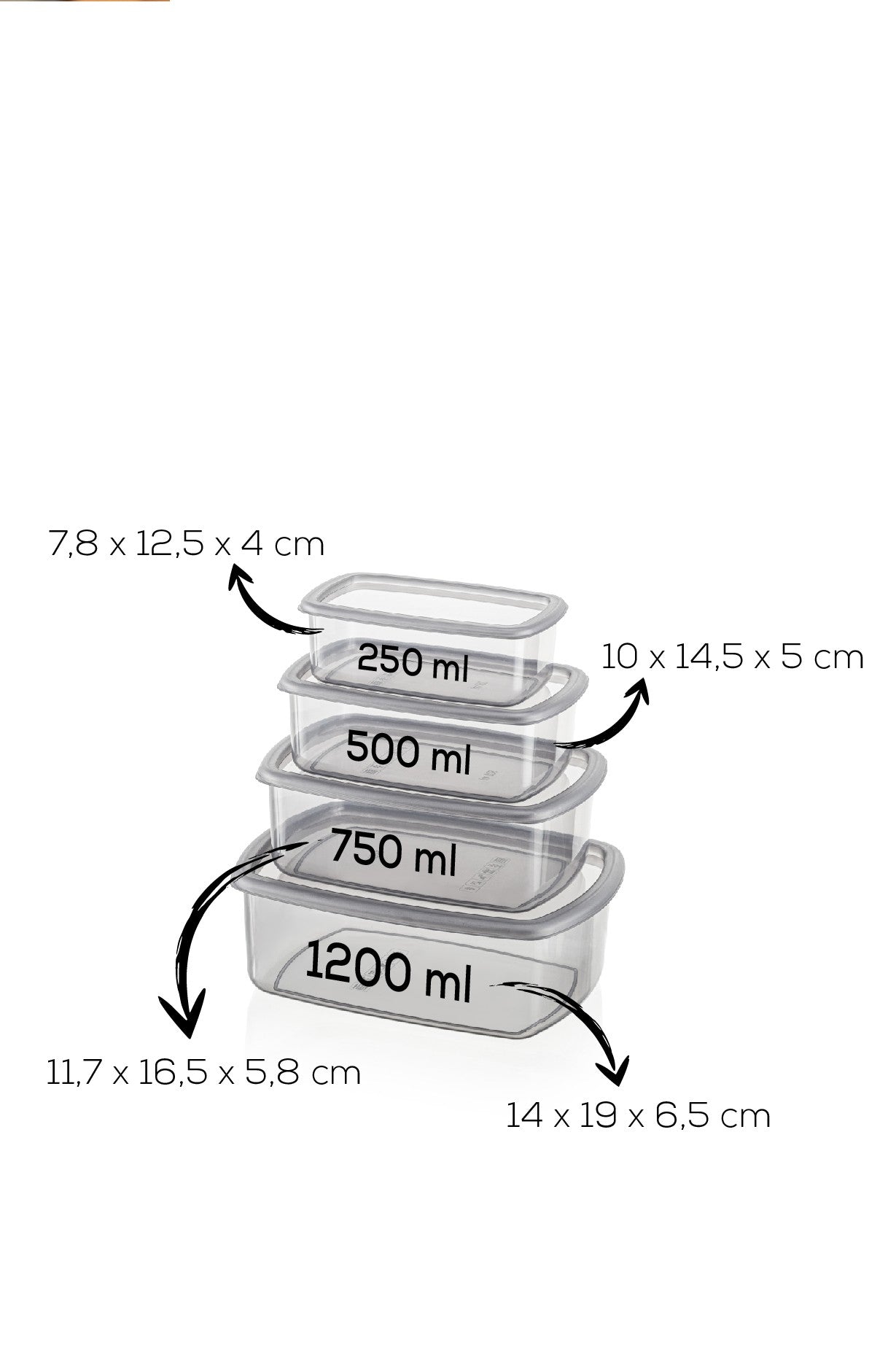 Capacities: 250 ml, 500 ml, 750 ml, 1200 ml, 2000 ml