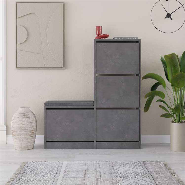 Elevate your entryway with this sleek and functional shoe cabinet featuring a contemporary concrete-effect finish. Designed with four spacious compartments, this unit provides ample storage to keep your footwear organized and easily accessible.