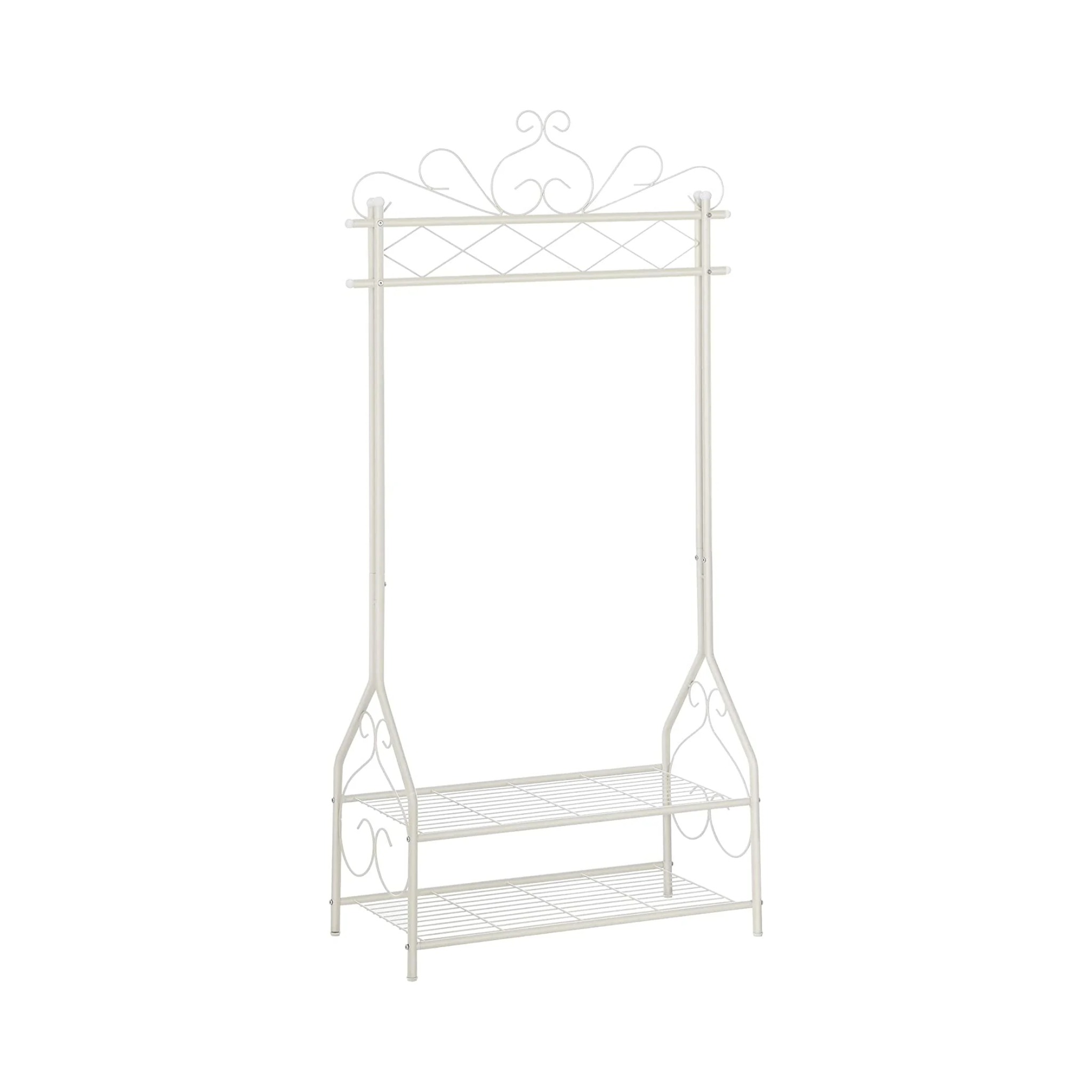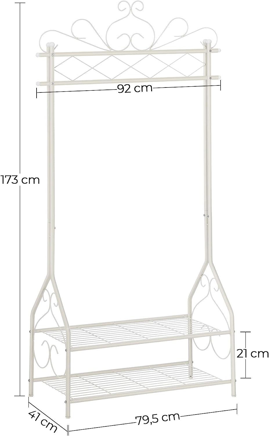 - Easy to carry and space saving. The upper rod has a max. Of 25 kg, each lower shelf of 10 kg. Thanks to the dimensions of 92 x 173 x 41 cm (width x height x depth), the metal coat rack fits in every corner