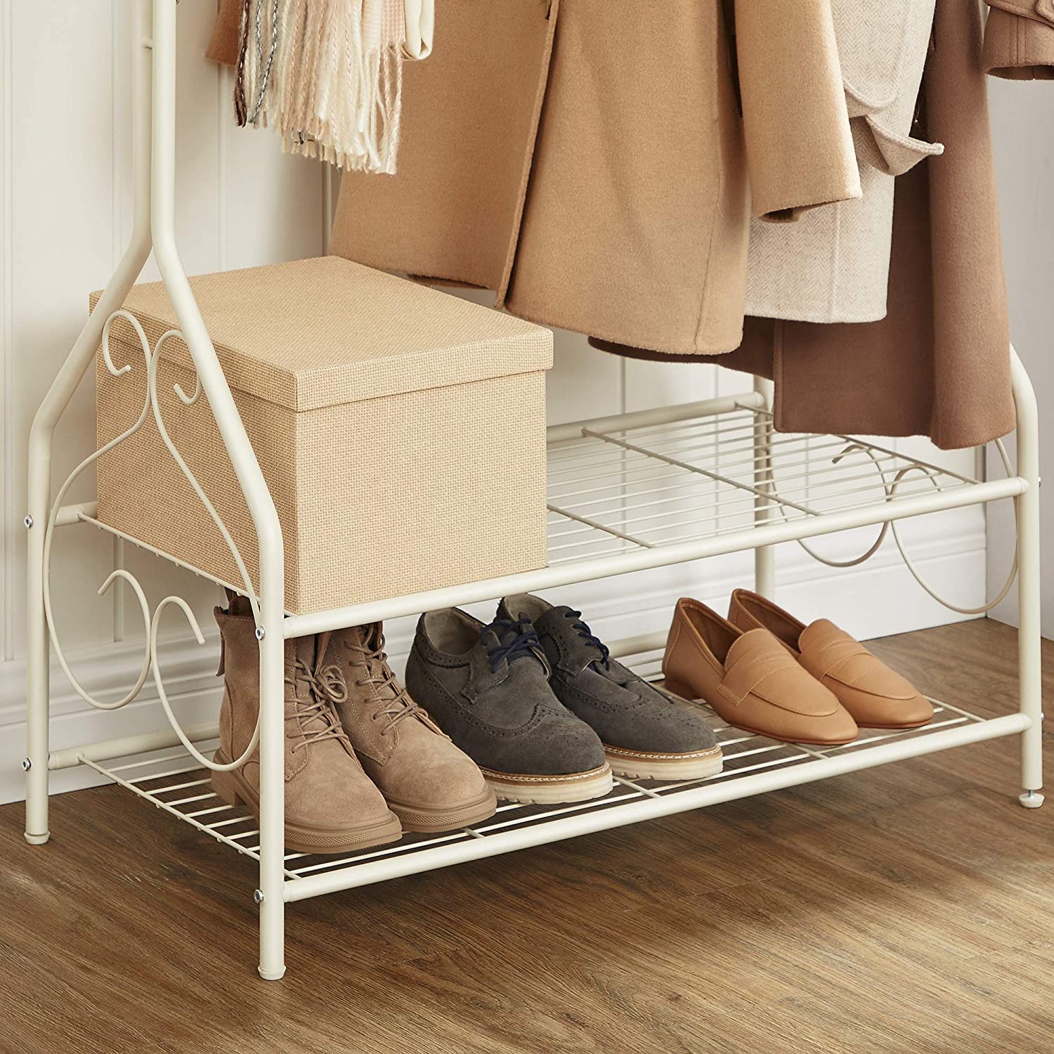 - Combine the clothes rail and shelves in one structure. At the top you can hang your clothes, hats and bags. Shoes and boxes are placed on 2 large shelves