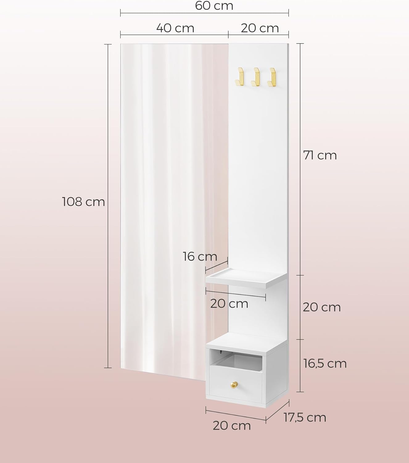 - Mirror with Storage] Hang your keys, hats or your pet's leash on the 3 hooks, put your glasses or small plants on the raised edge tray and store your watches in the drawer. All your items have their place