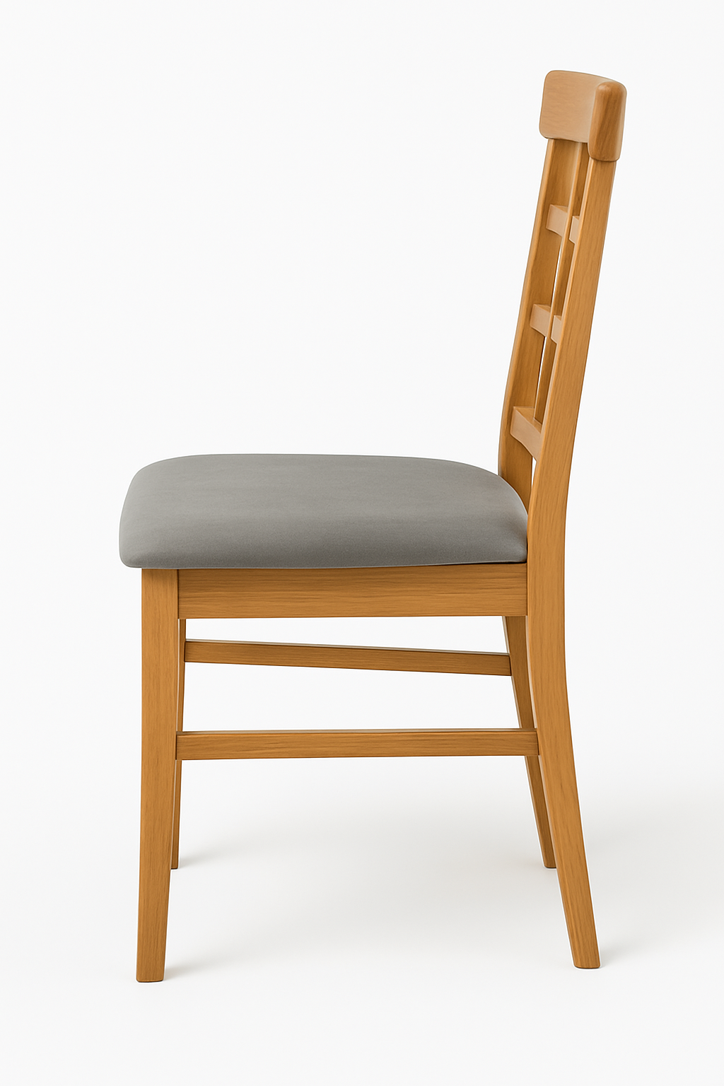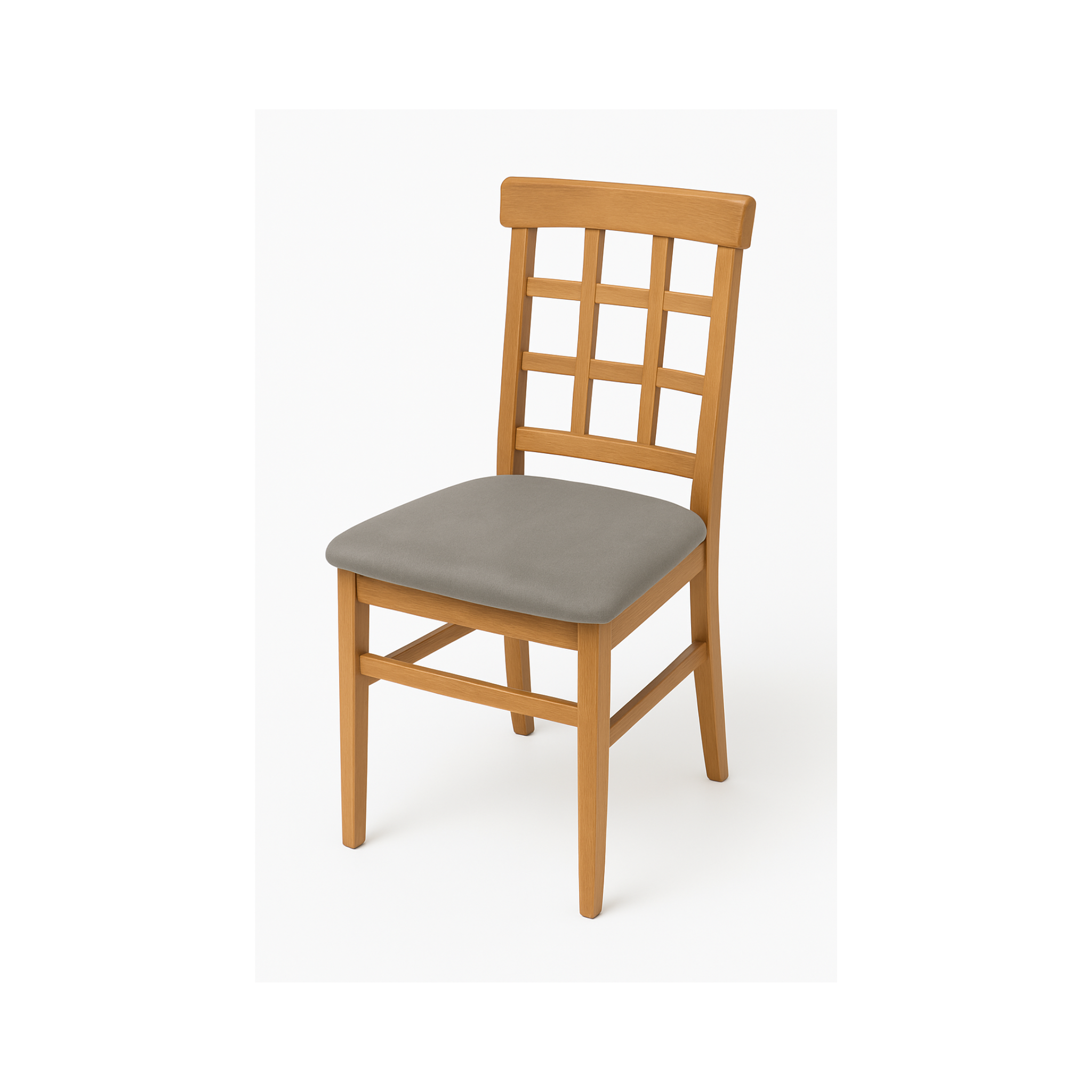 Bring timeless charm and comfort to your dining space with this rustic wooden chair. Crafted from durable solid wood, it features a sturdy frame with a stylish grid-pattern backrest that blends classic design with modern elegance. The padded seat is upholstered in a soft, neutral-toned fabric, ensuring both comfort and versatility to complement any décor. Perfect for dining rooms, kitchens, or even as an accent chair, this piece adds warmth and sophistication to your home.