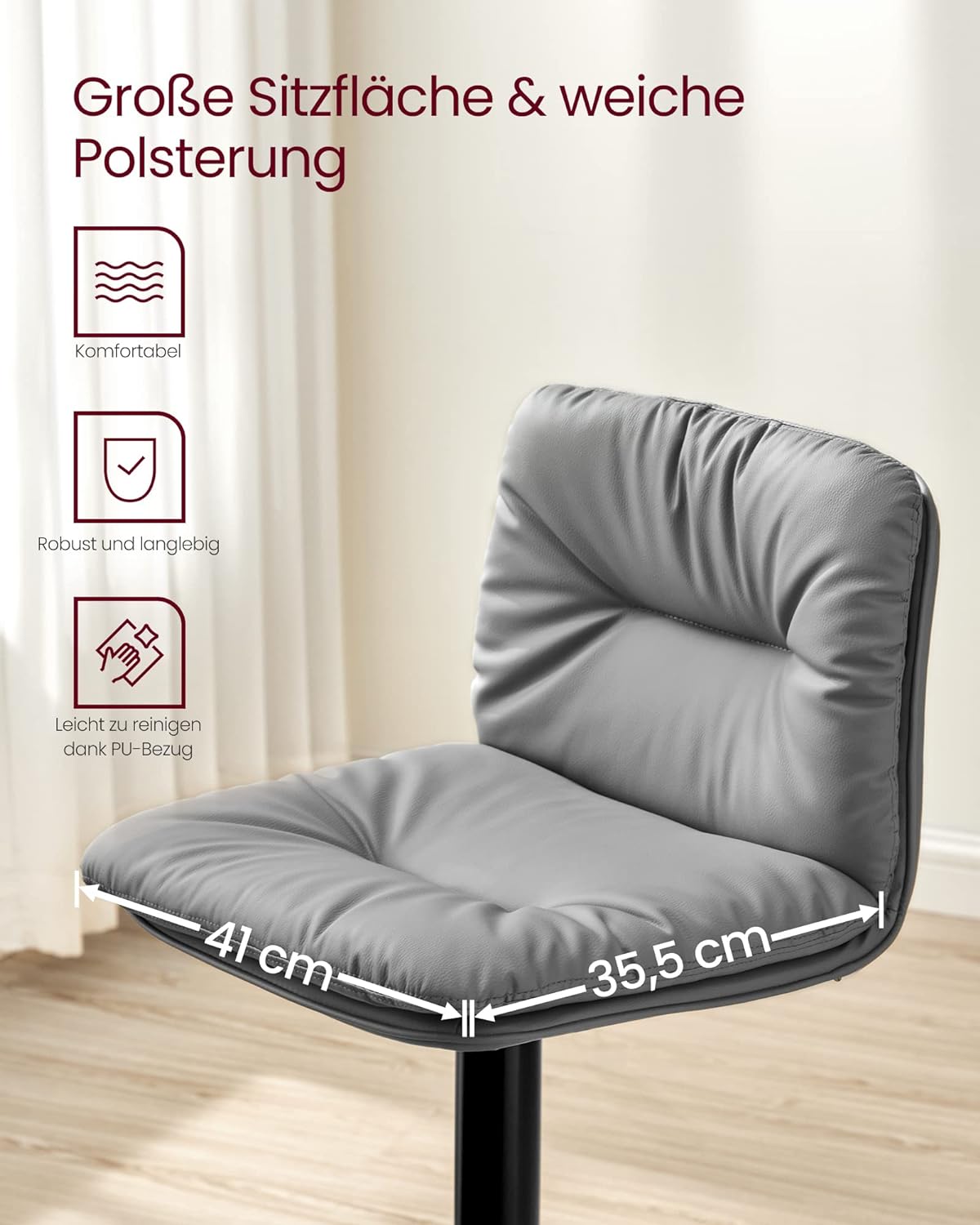 Premium PU cover: Covered with high-quality faux leather, the bar chairs are skin-friendly and ensure pleasant coolness on hot summer days. Besides, the surface is smooth and easy to clean with a cloth