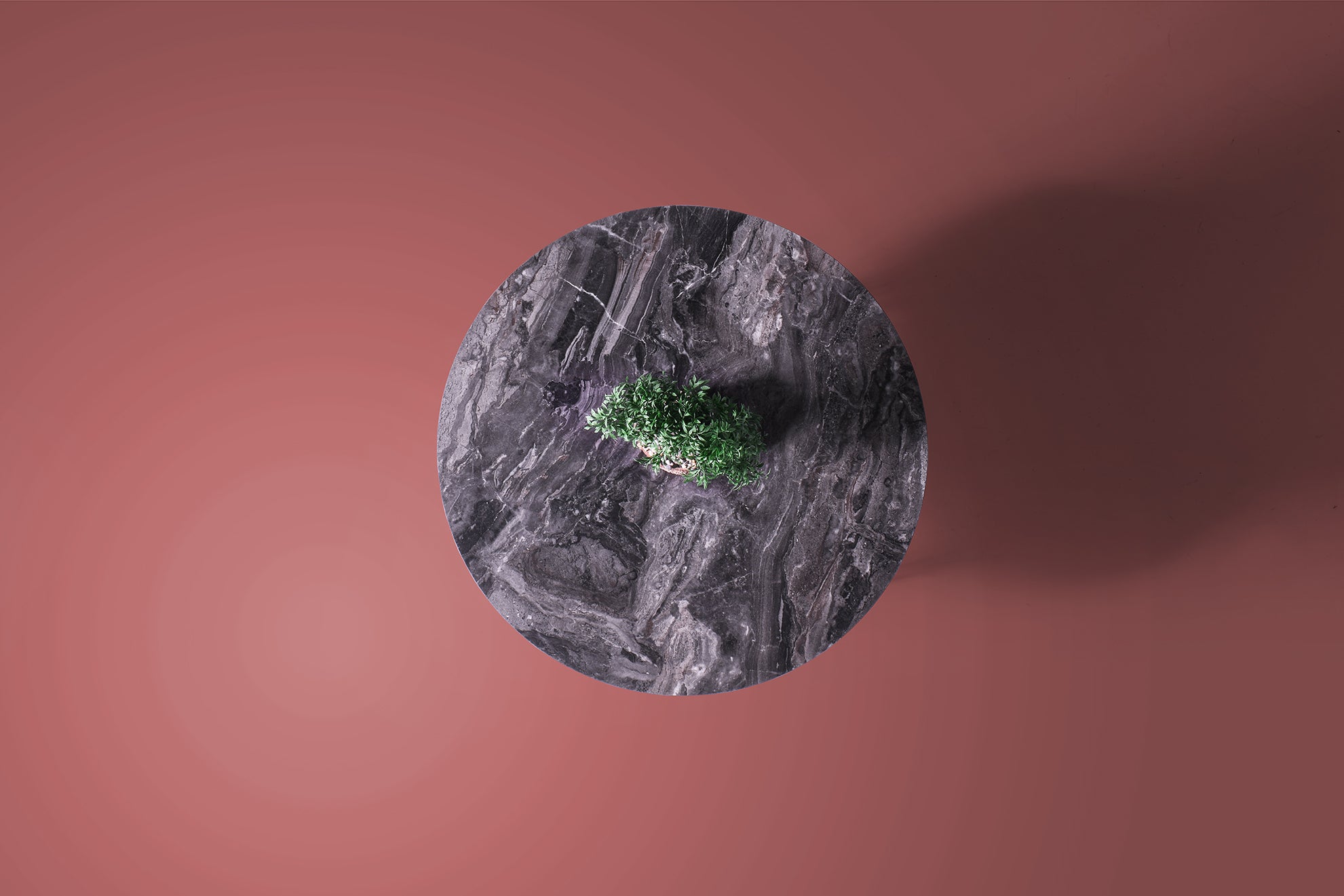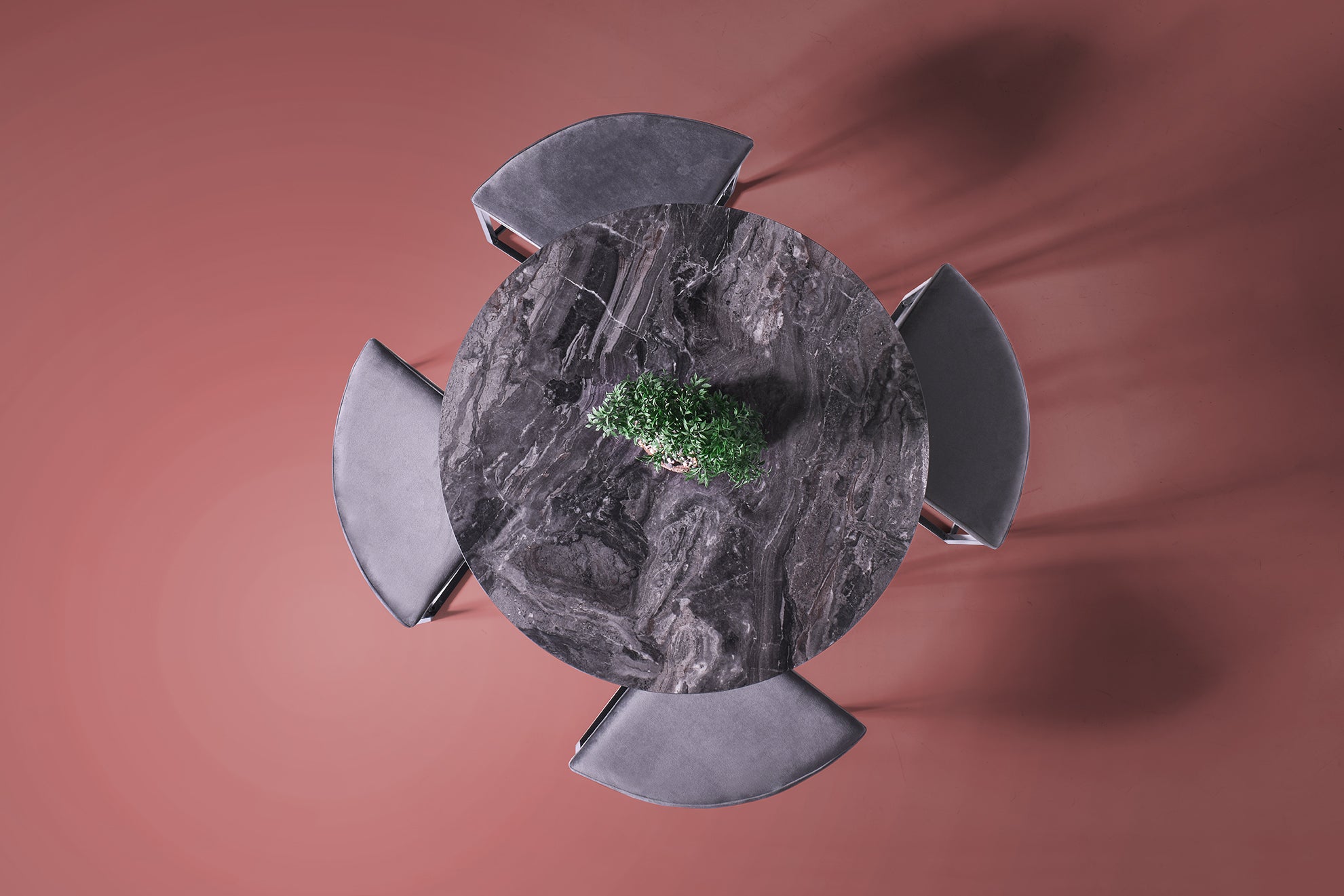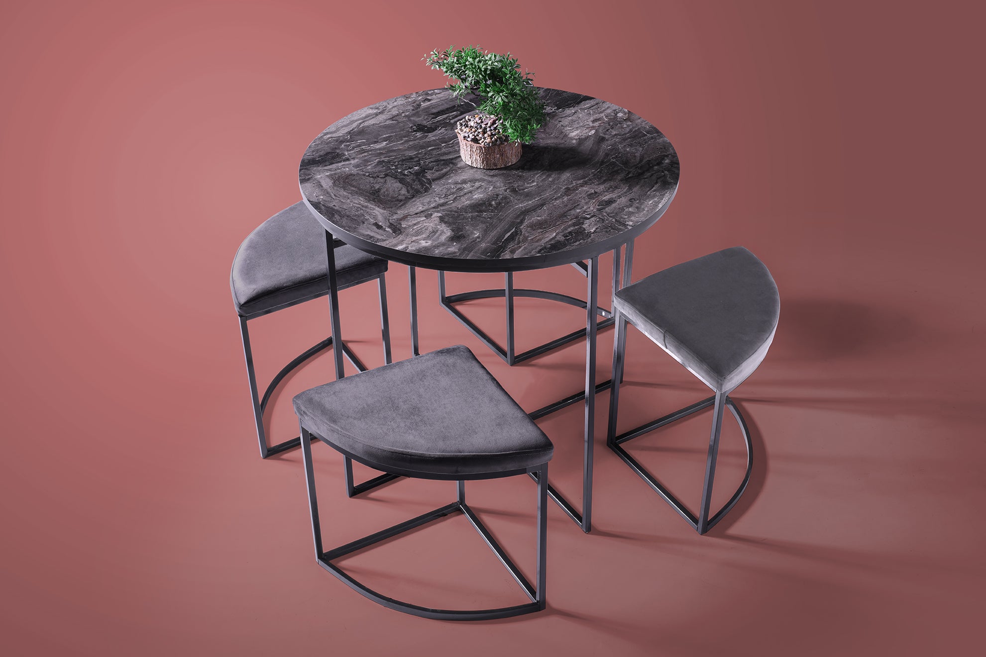 This stylish dining set features a sleek round table with a black marble-look top and a sturdy metal frame. Designed for space-saving efficiency, the set includes four triangular stools that seamlessly slide under the table to form a compact, unified unit.