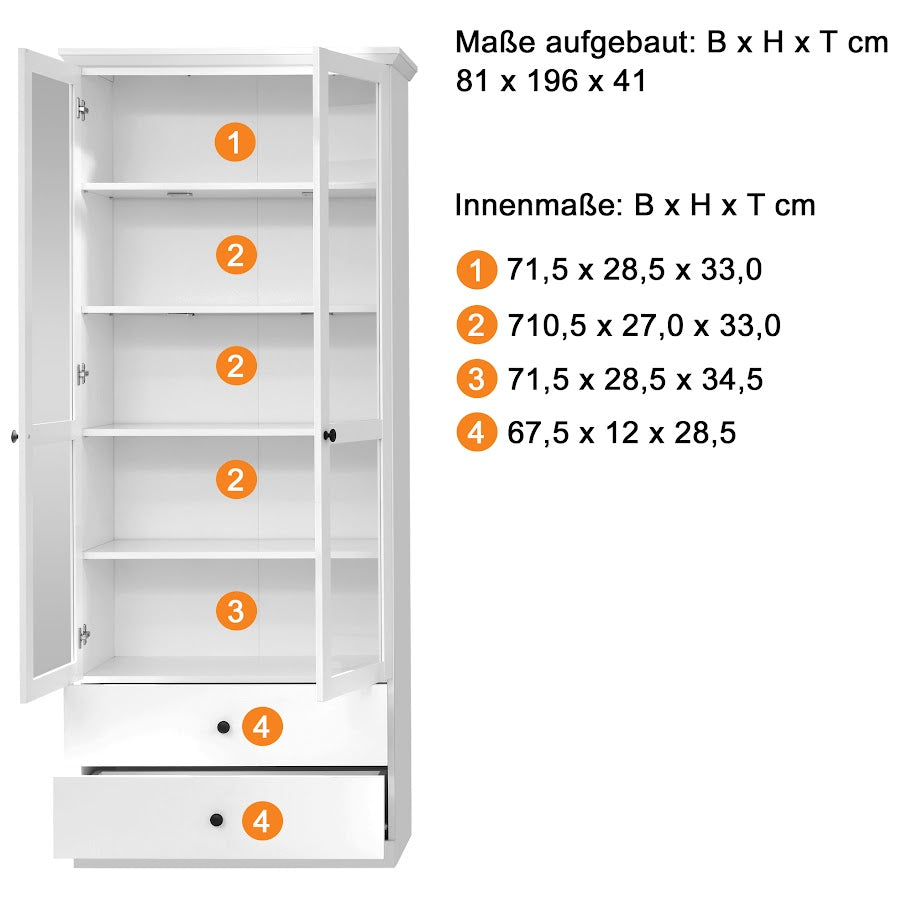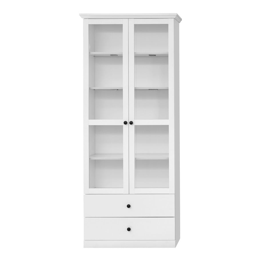 Showcase your dinnerware and collectibles in timeless style with the Brandson Baxter Glass Display Cabinet. This elegant white cabinet features clear glass doors, five spacious shelves, and two practical drawers—offering both display and hidden storage options.