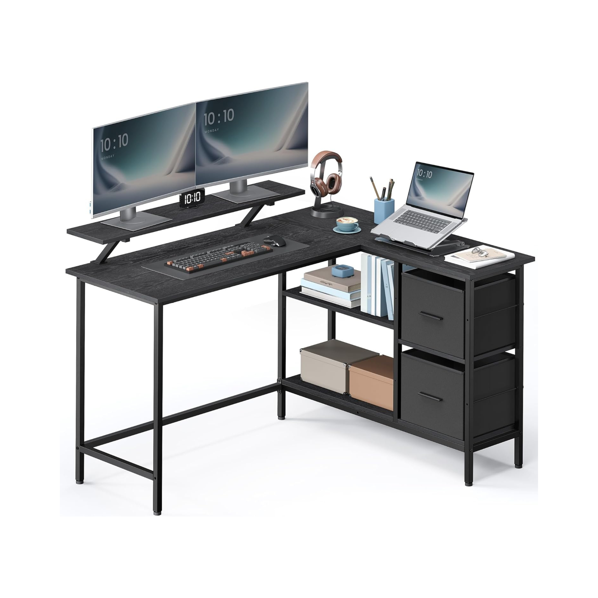 - 【AMPLE STORAGE SPACE】Featuring 2 spacious storage drawers, this corner desk offers ample room for files and office essentials. The middle shelf is adjustable to 3 height levels, catering to your storage requirements