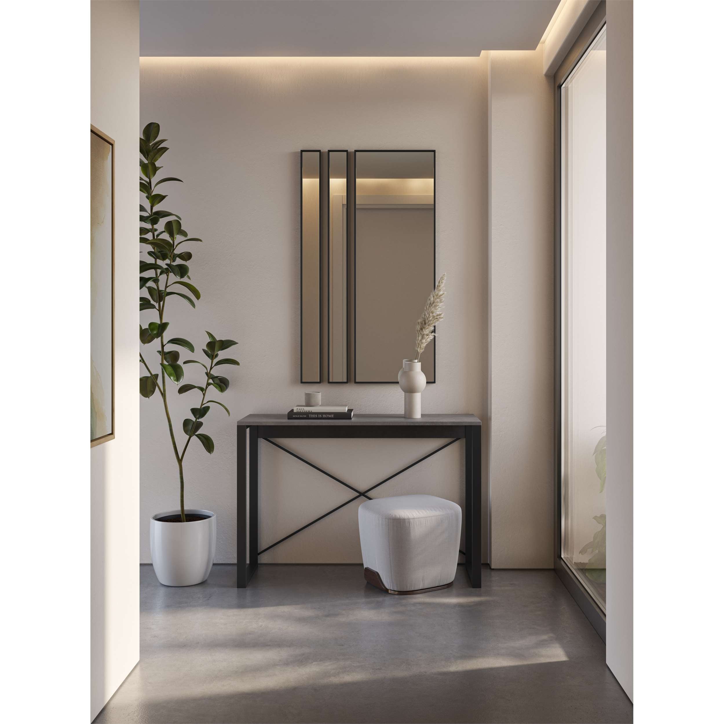 Enhance your entryway, living room, or hallway with this stylish console table, designed to add a touch of contemporary elegance to any space. Featuring a smooth grey wood top and a sturdy black metal frame, this table seamlessly blends modern aesthetics with functional design.