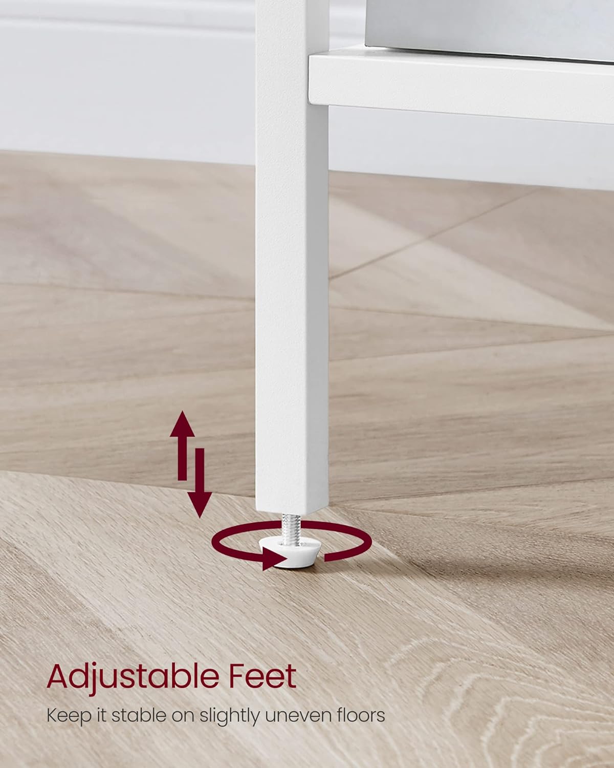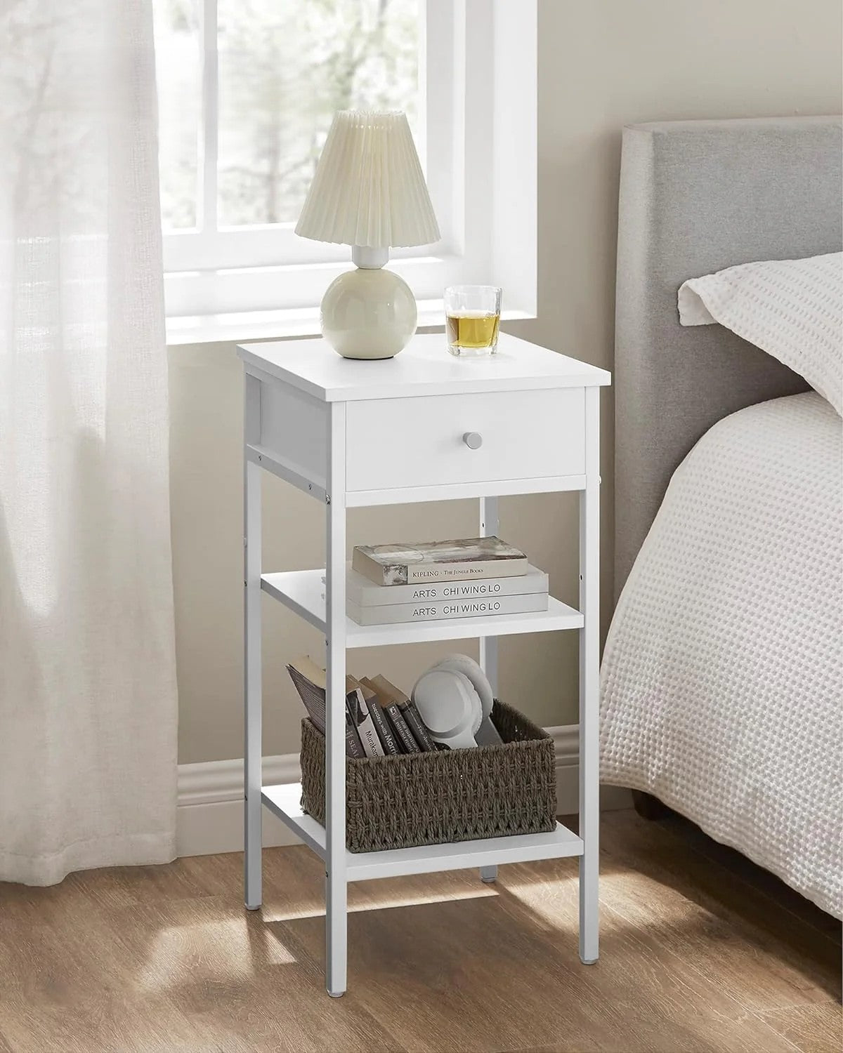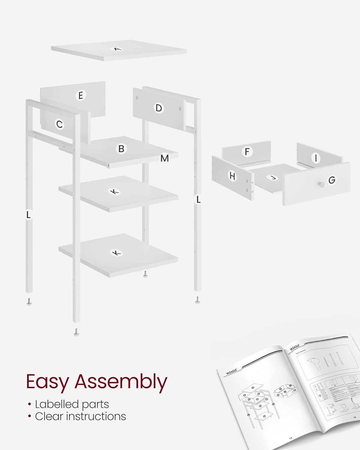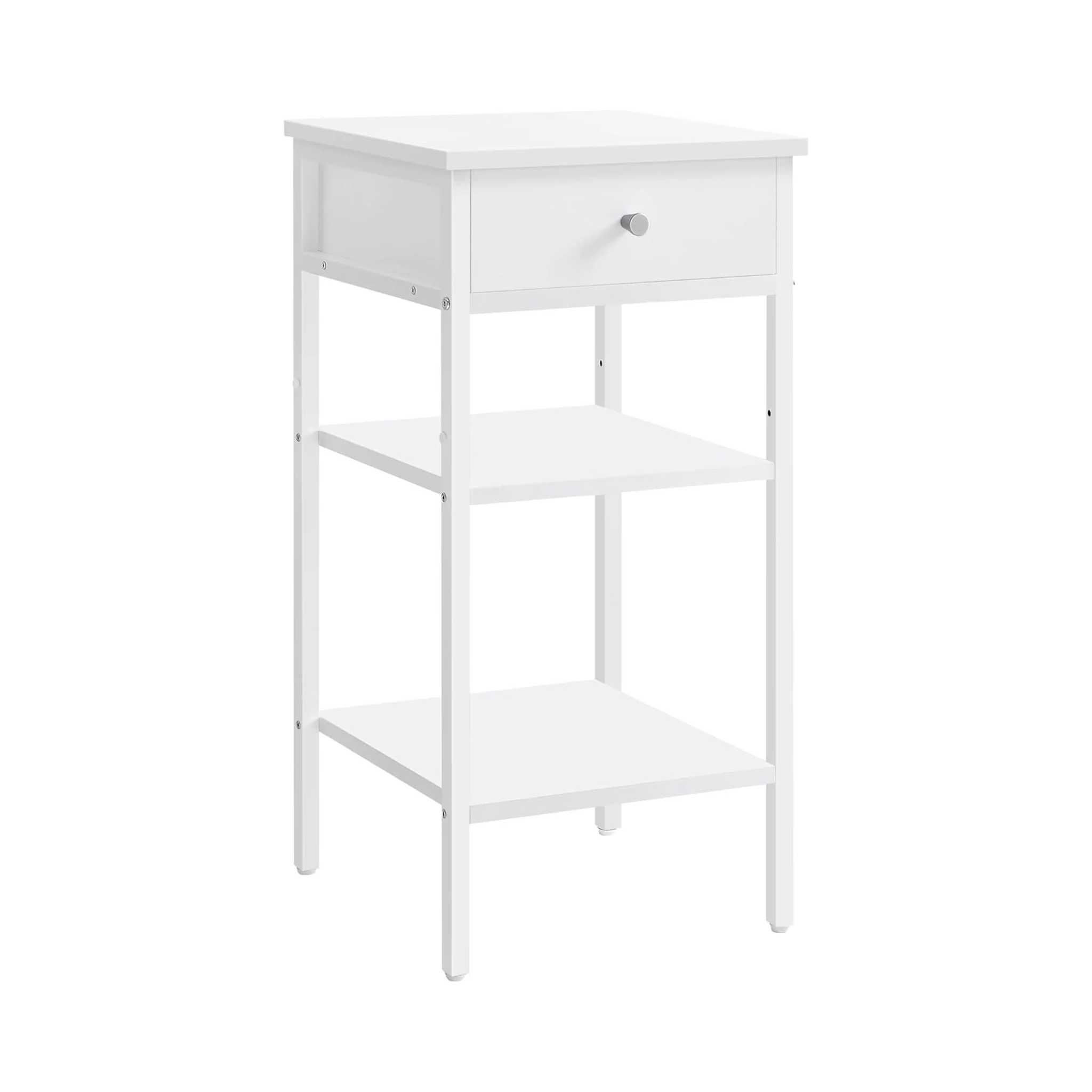 [Sturdy Construction] Constructed from high-quality particleboard and steel, this side table features a sturdy structure that holds up to 40 kg in total: 20 kg on the top, 5 kg in the drawer, and 10 kg per shelf–you can safely store all your items
