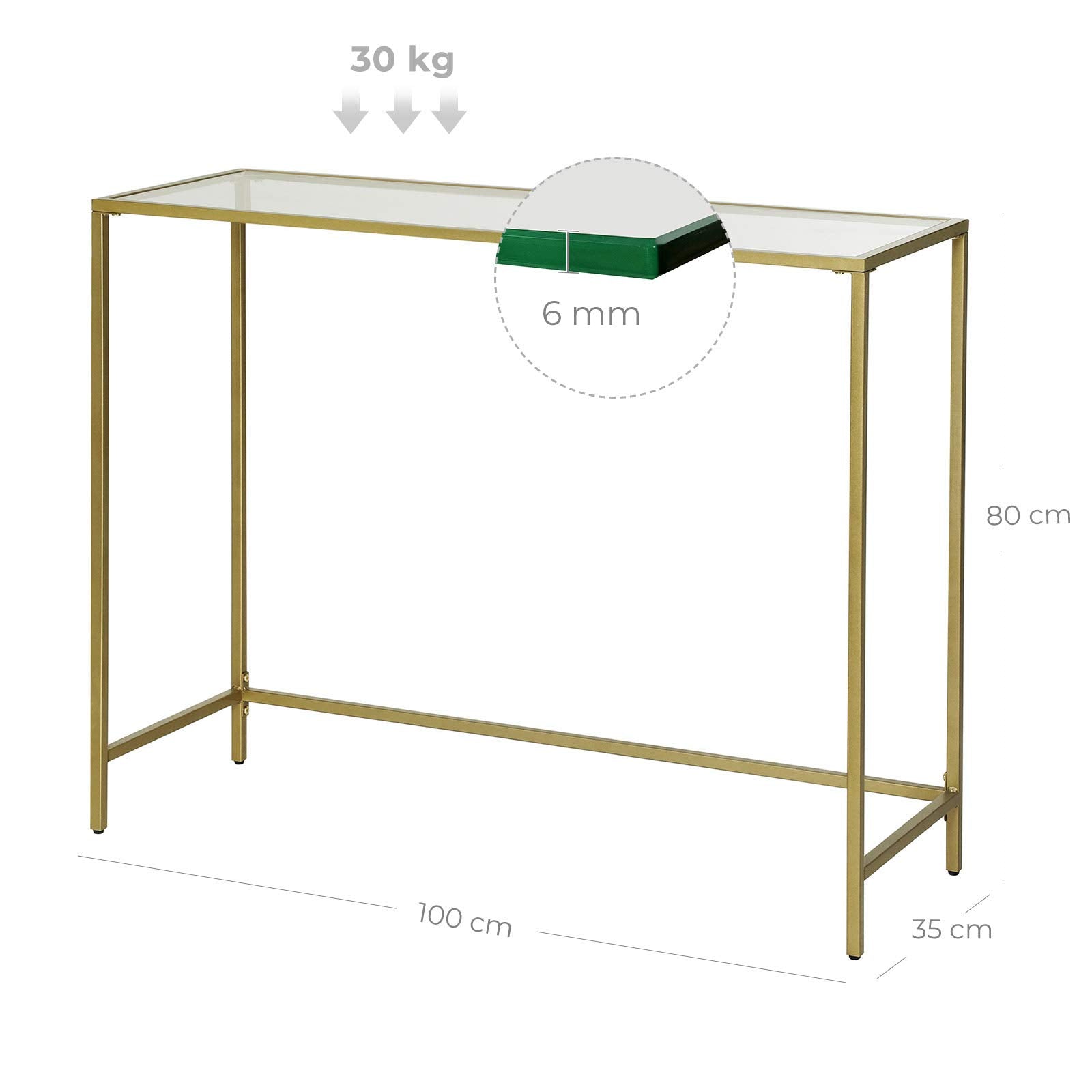 - Perfect Match: 6 mm thick tempered glass sits nestled atop the metal frame of this 100 x 35 x 80 cm (L x W x H) console table, offering sturdy support for up to 30 kg of plants, decorations, books, or cherished family heirlooms