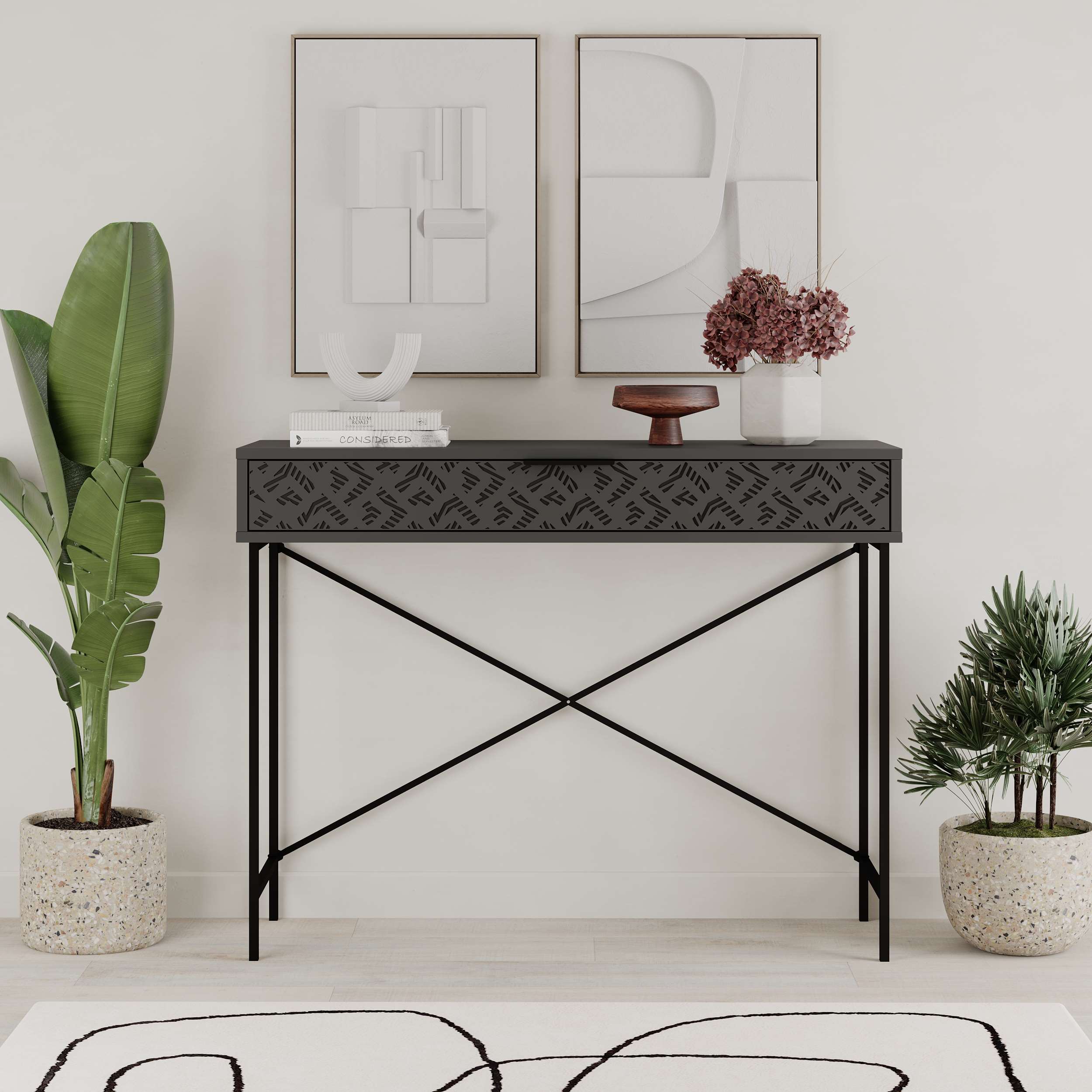 - The spacious tabletop provides a versatile platform for decorative displays, personal mementos, or everyday essentials. Whether gracing your entryway, living room, or hallway, this console table offers both a focal point and a practical storage solution.