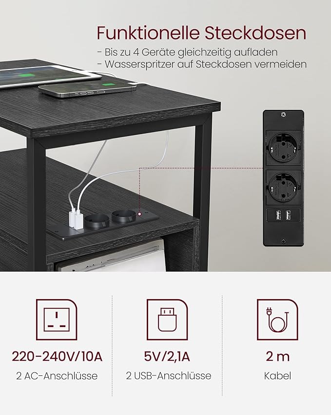 - Built-in power strip: With 2 AC ports, 2 USB ports and a 2 m charging cable, you can charge your devices. This also allows you to avoid tangled cables and thus create an orderly environment