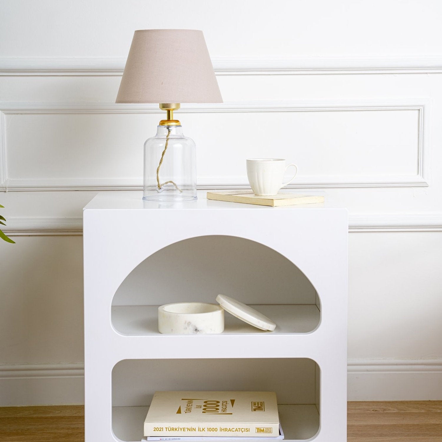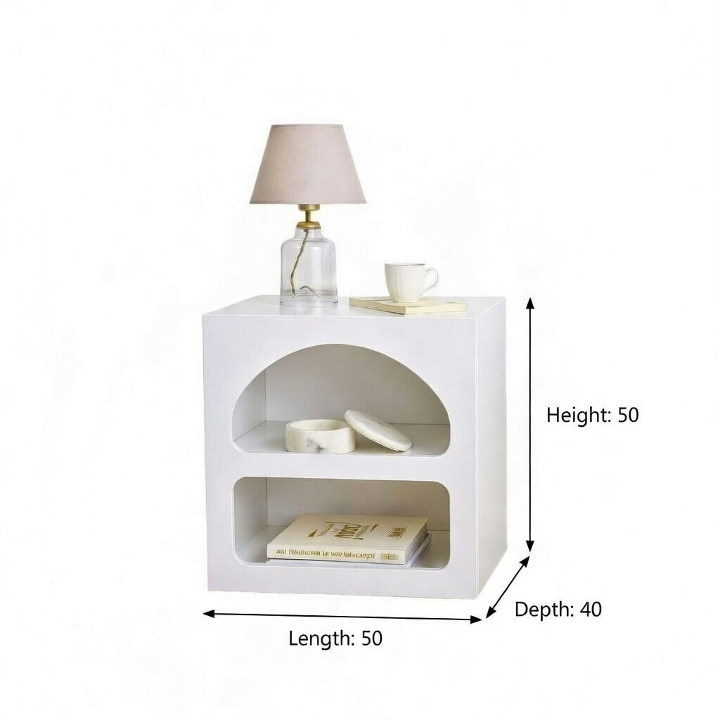 Clean lines with a gentle curve. This modern nightstand brings a touch of architectural elegance to your bedroom. Featuring a unique arched cutout and a secondary rectangular storage nook, it perfectly balances open display space with a minimalist, box-frame silhouette.