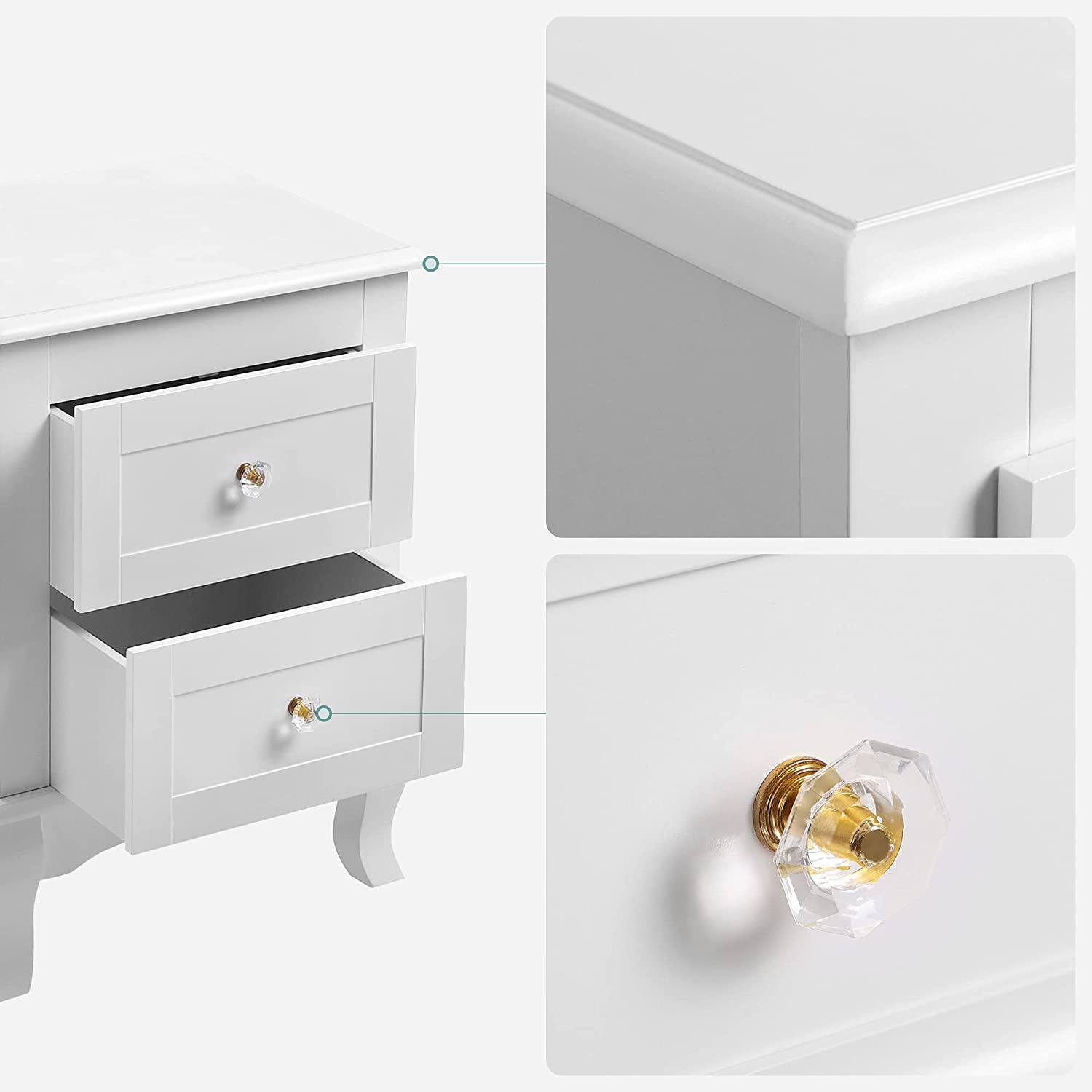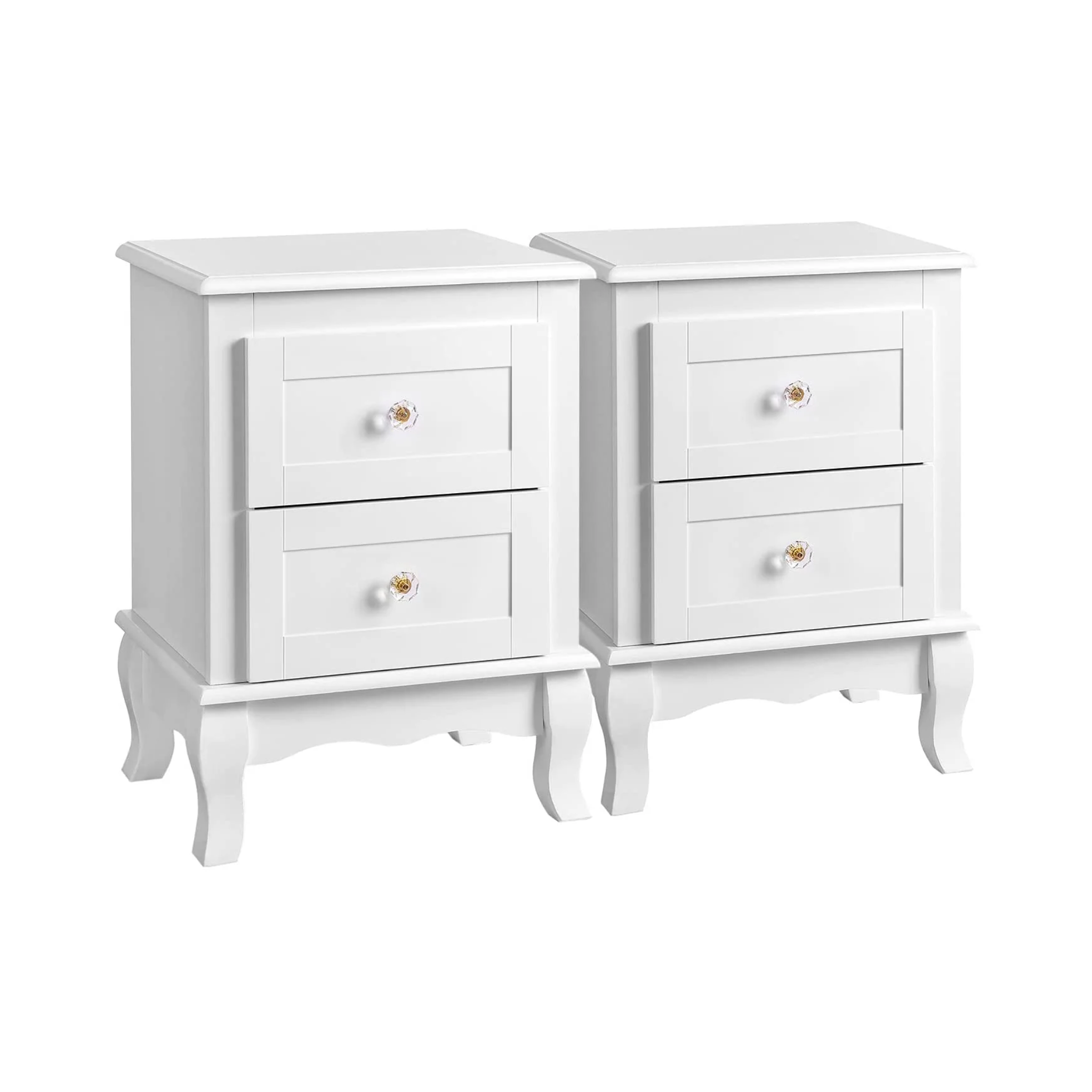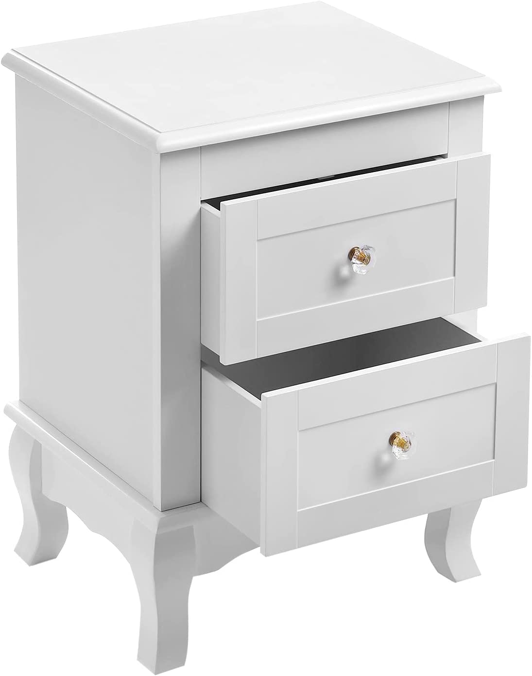 - SIMPLE WHITE ROMANCE: The unique design of this set of bedside tables with a white, non-toxic, UV-cured paint appears rich in European elements while still giving your room a very modern, romantic style