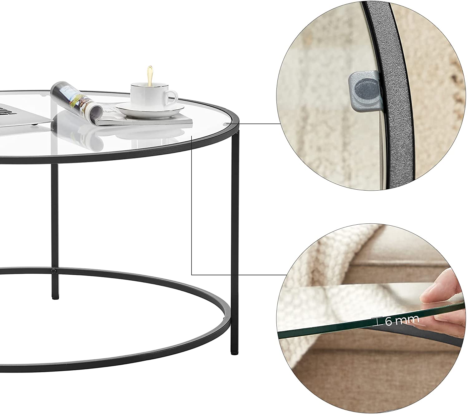 - Delicate but solid: The top of this coffee table is made of 6 mm thick tempered glass, which is particularly robust and impact-resistant. Its load capacity is 70 kg