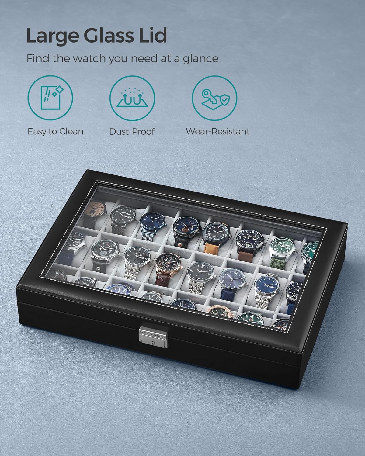 - [Clear Glass Lid] The large see-through glass lid of this watch case allows you to see and find the right watch at a glance. Plus, it’s durable and easy to clean