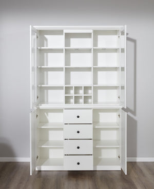 Elevate your dining or living space with the timeless charm of the Baxter White Sideboard Hutch. Finished in crisp white with elegant black knobs, this multifunctional cabinet combines display elegance with smart storage. The upper section features glass doors with shelving—perfect for showcasing fine china, glassware, or décor—while the lower half includes four drawers and two cabinets for hidden storage. A central wine rack-style cubby adds a stylish and practical touch.