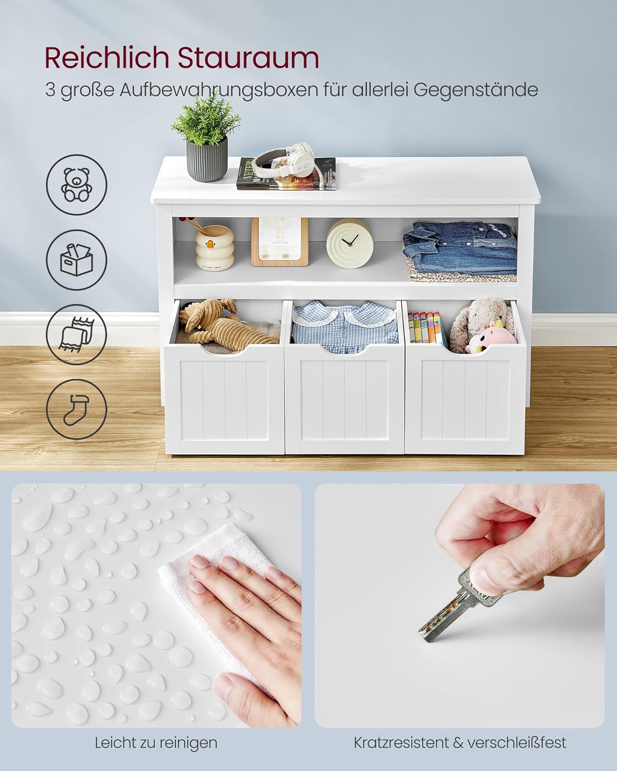 - Cleverly designed: a storage area at the top, an open compartment, 3 boxes (29 x 30 x 28 cm) at the bottom. This toy cabinet offers enough space for everything: balls, dolls, building blocks and picture books can be beautifully sorted and conveniently stored