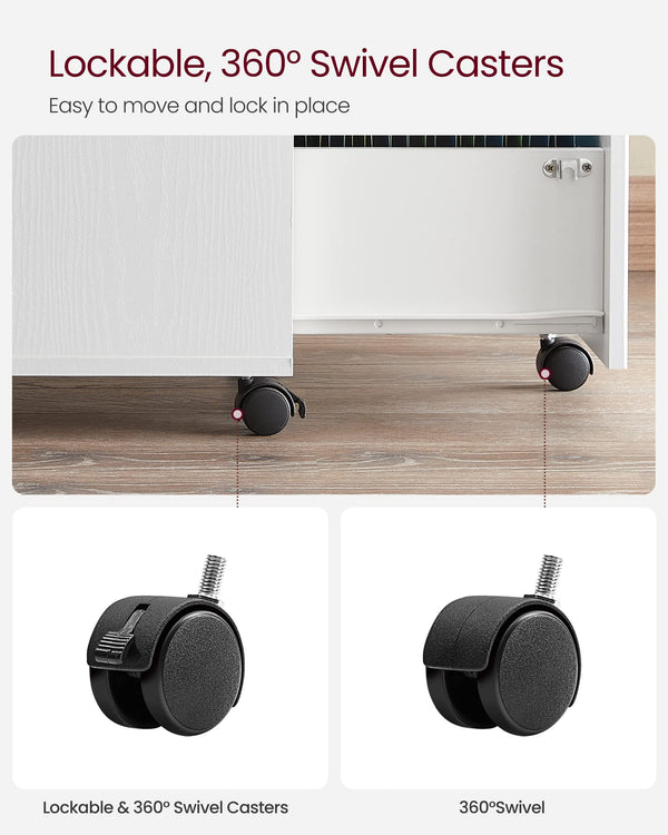 - 【LOCKABLE, SWIVEL CASTERS】Five 360° swivel wheels allow you to move this filing cabinet around with ease. The 2 front wheels are lockable to keep the cabinet in place when stationary and the fifth wheel on the bottom drawer adds to overall stability