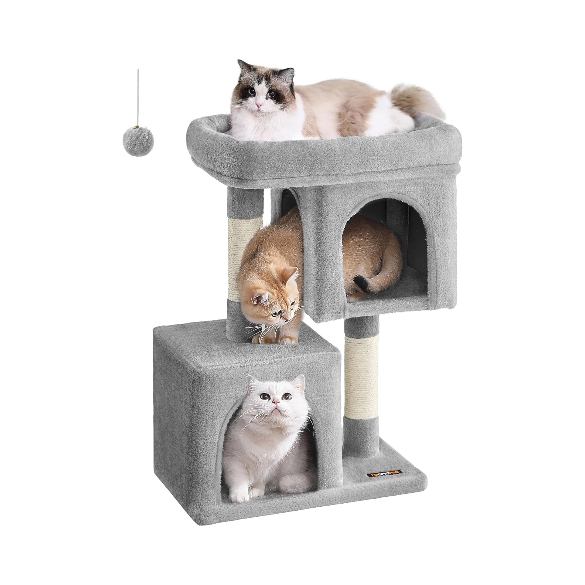 - [Climb. Scratch. Relax. All in One] The multi-level design is easy for cats to climb up and down. 2 scratching posts meet cats’ natural instincts. The top perch is great for looking out the window. 2 caves let them relax and recharge in comfort