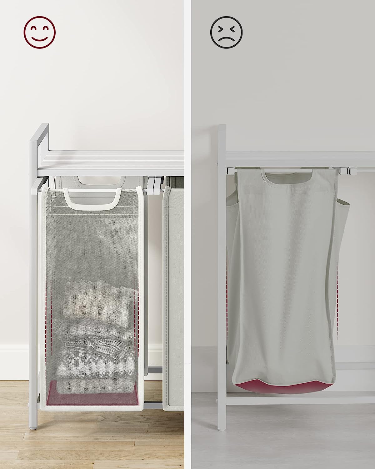 - [Triple basket, organized by type] This laundry hamper offers a total capacity of 114L (38L for each bag); 3-compartment design helps you organize clothes by type or divide light from dark